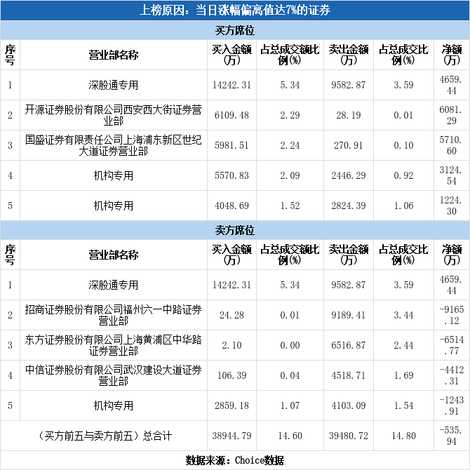 今日龙虎榜单上出现了深股通的身影,占据了买一、卖一的位置,净买入4659.44万元,占当日成交总额的1.75%。