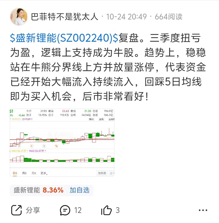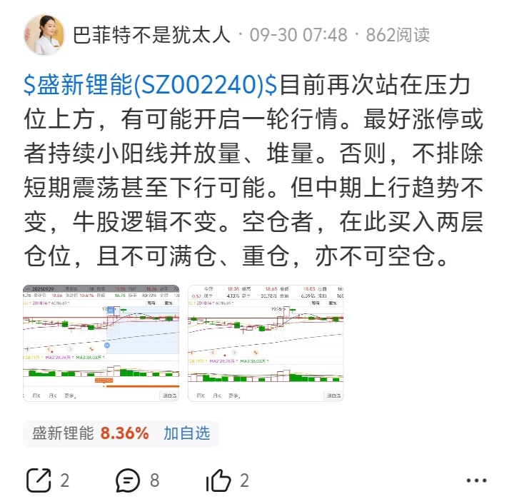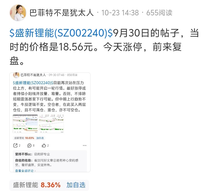 9月30日突破牛雄分界线18.32元后,发帖看涨,并多次复盘。