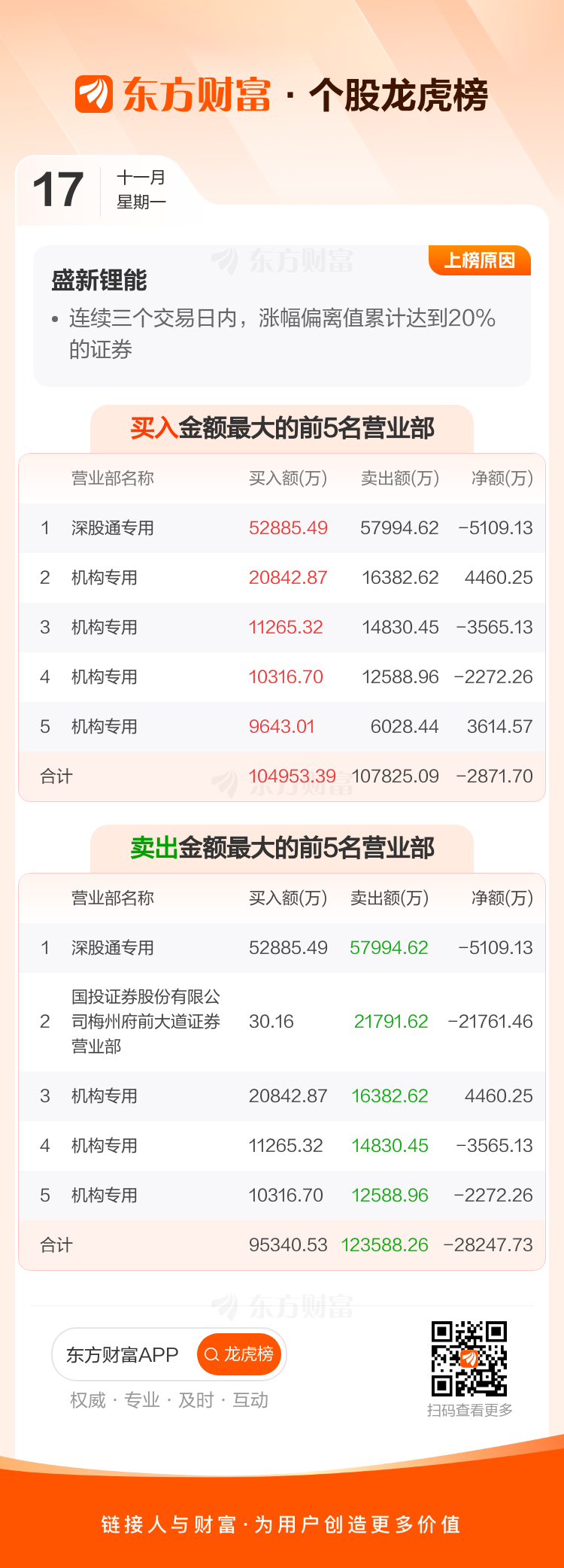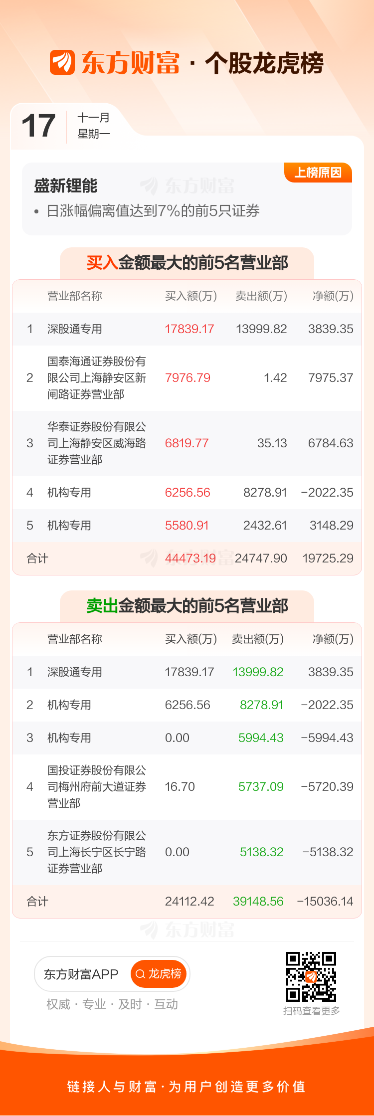 交易所2025年11月17日公布的交易公开信息显示,盛新锂能因成为日涨幅偏离值达到7%的前5只证券、连续三个交易日内,涨幅偏离值累计达到20%的证券上榜。盛新锂能当日收报35.93元,涨跌幅10.01%,偏离值9.99%,换手率10.60%,成交额32.51亿。异常期间11月13日至11月17日,期间涨幅27.41%,累计偏离值27.25%,区间成交额92.61亿。