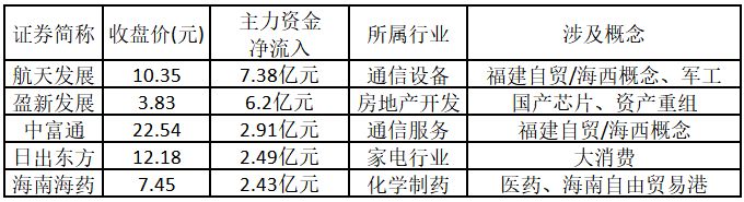 从主力资金来看,今日涨停板个股中,主力资金净流入金额排名前5的个股分别为航天发展、盈新发展、中富通、日出东方、海南海药。