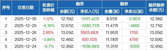 盛新锂能:融资净偿还5191.42万元,融资余额12.15亿元(12-30)