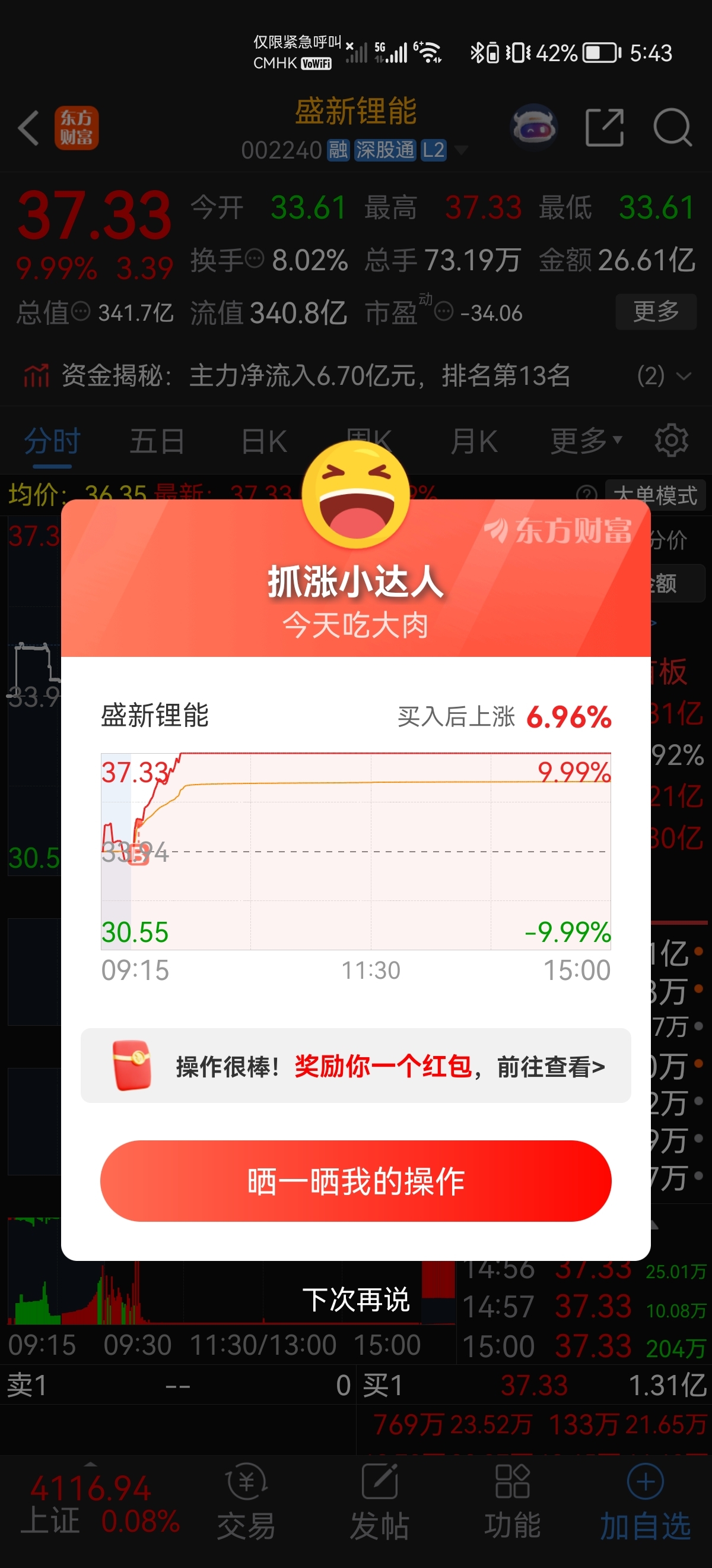 $盛新锂能(SZ002240)$ #炒股日记# 早盘异动,买入吃肉