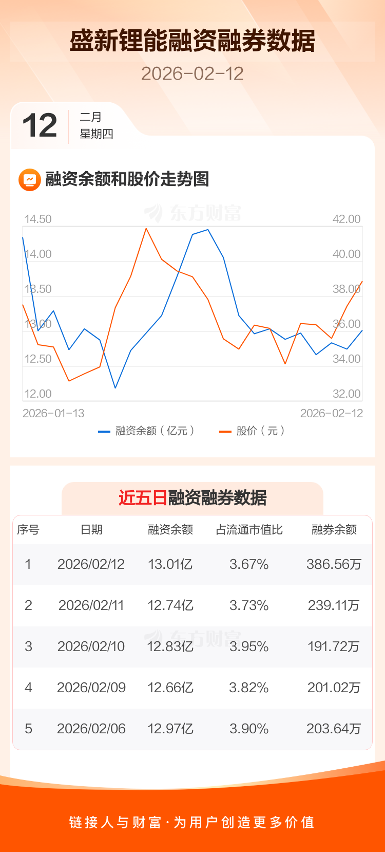 交易所最新数据显示,盛新锂能于2026年2月12日获融资买入1.68亿元,融资偿还1.41亿元,当日融资净买入2680.05万元。目前,该股融资余额13.01亿,占流通市值比例为3.67%。