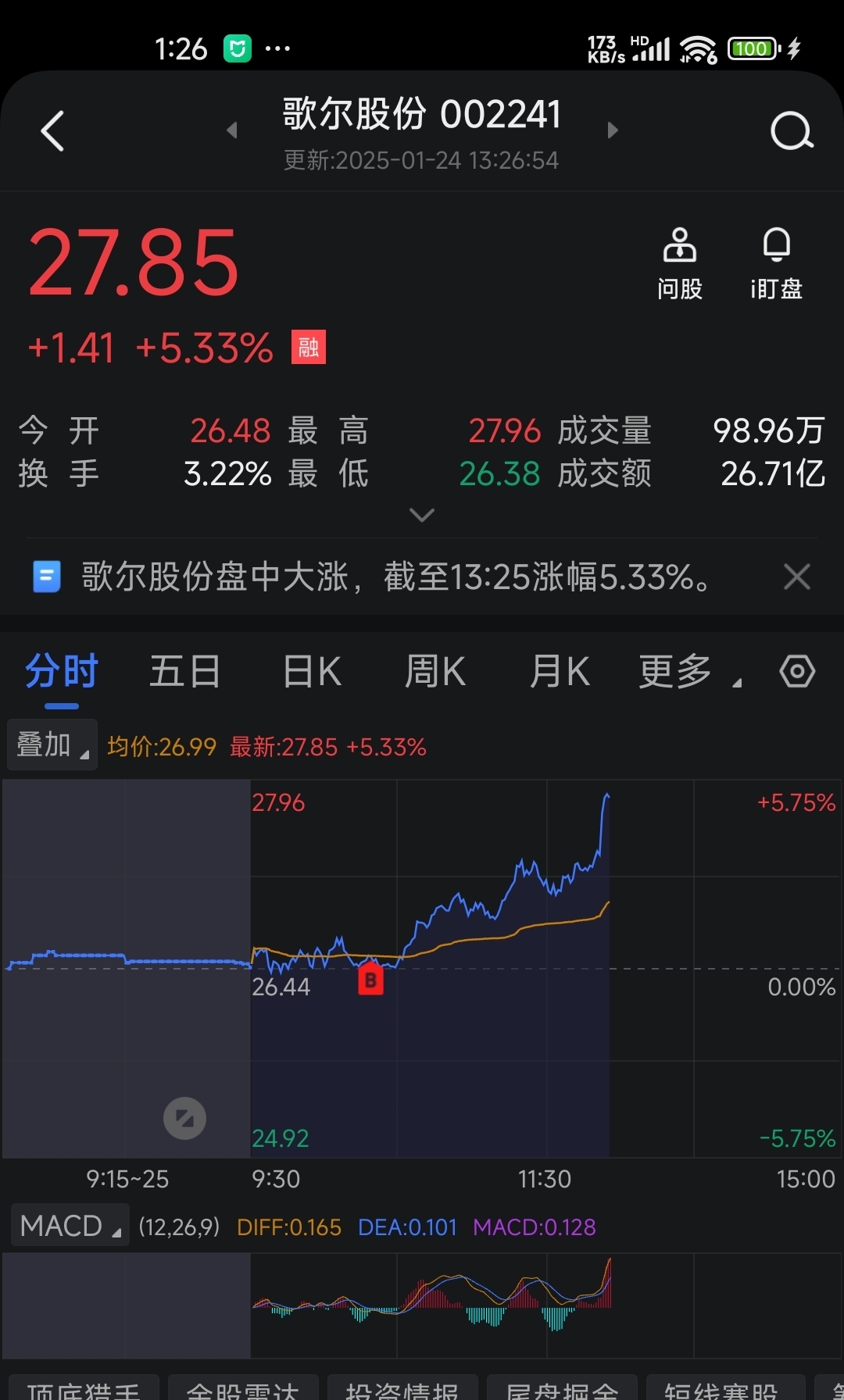 $歌尔股份(SZ002241)$ 前几天27.6清仓,今天26.5水下再次买入