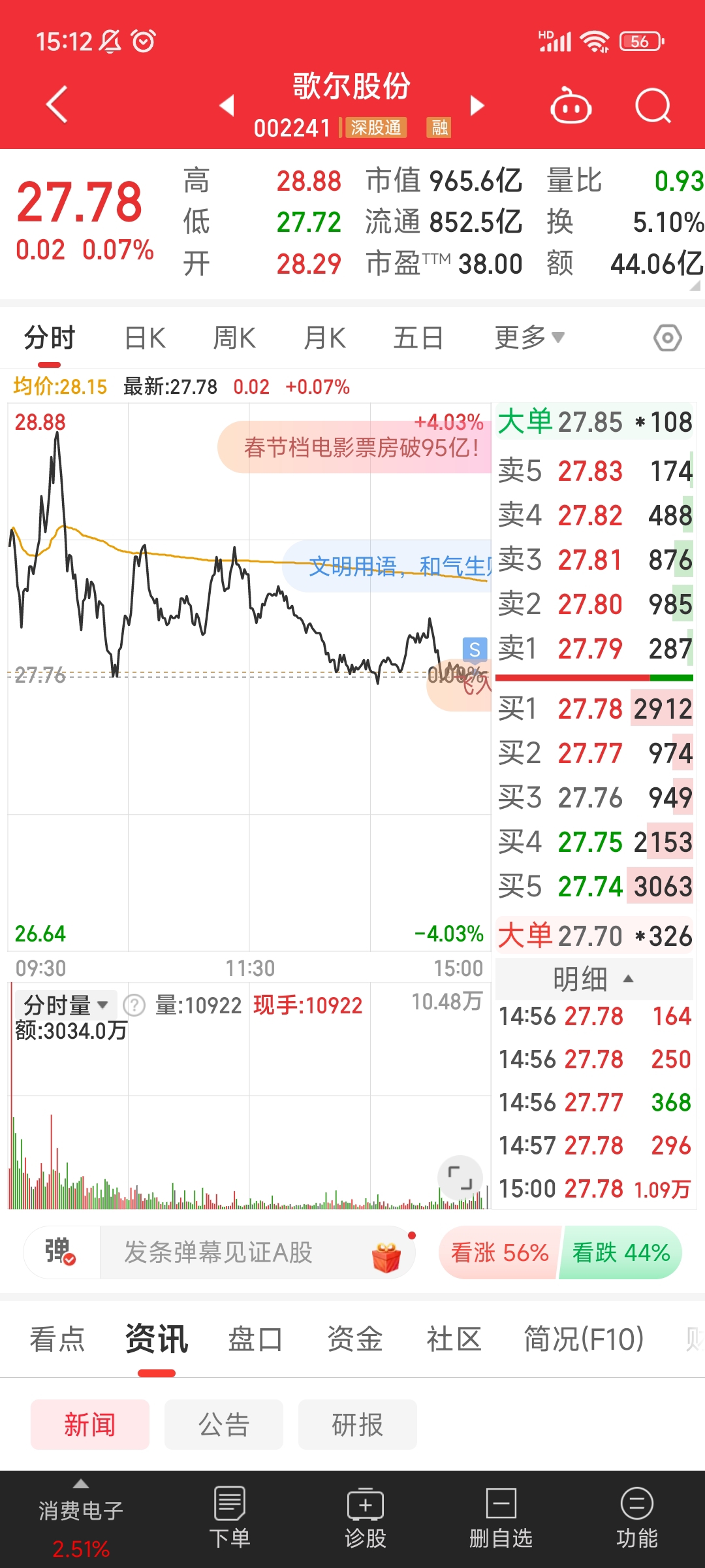 $歌尔股份(SZ002241)$ 尾盘出了3/4 短期不看好这货了,觉得它要回调
