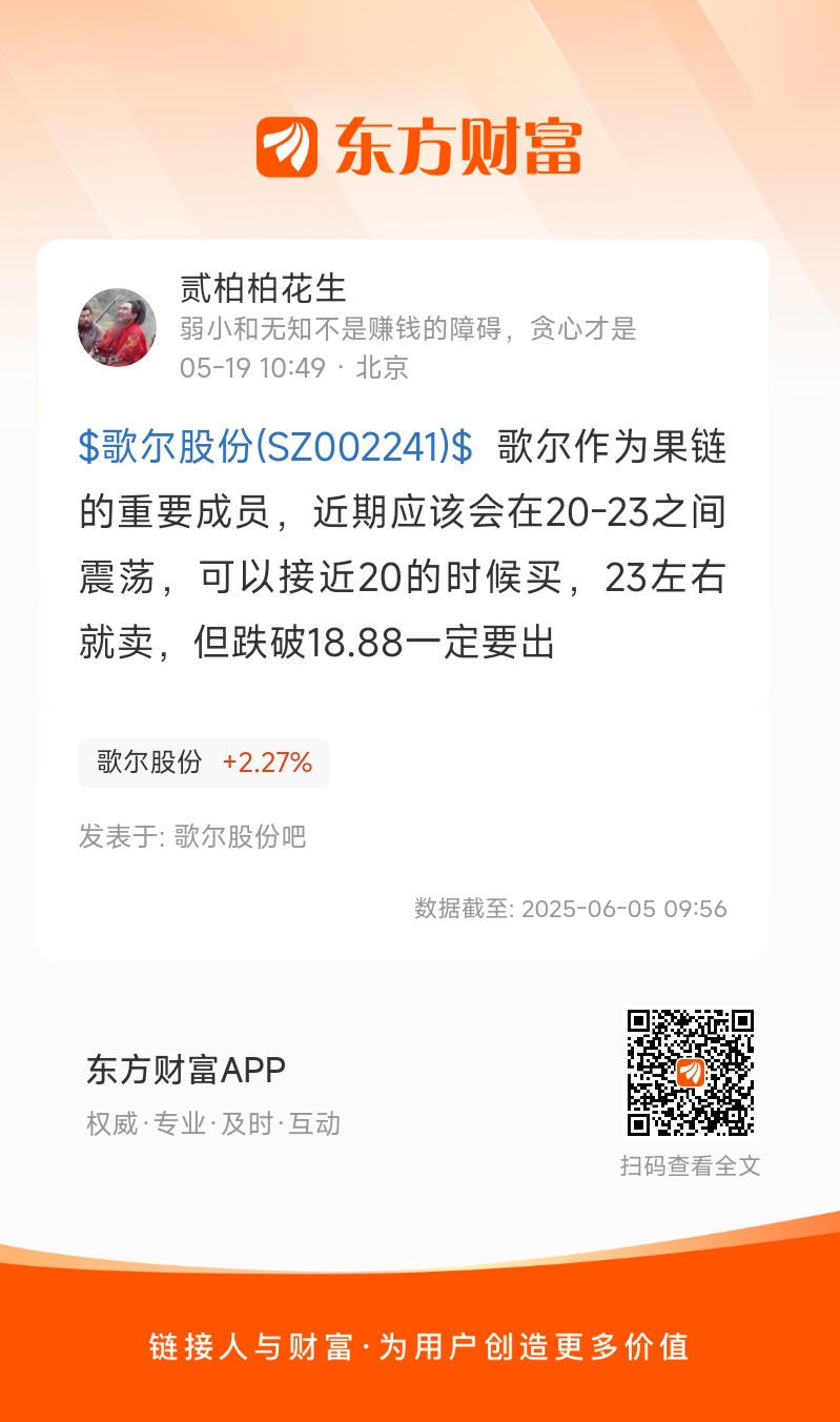 $歌尔股份(SZ002241)$ 歌尔作为果链的重要成员,近期应该会在20-23之间震荡,可以接近20的时候买,23左右就卖,但跌破18.88一定要出