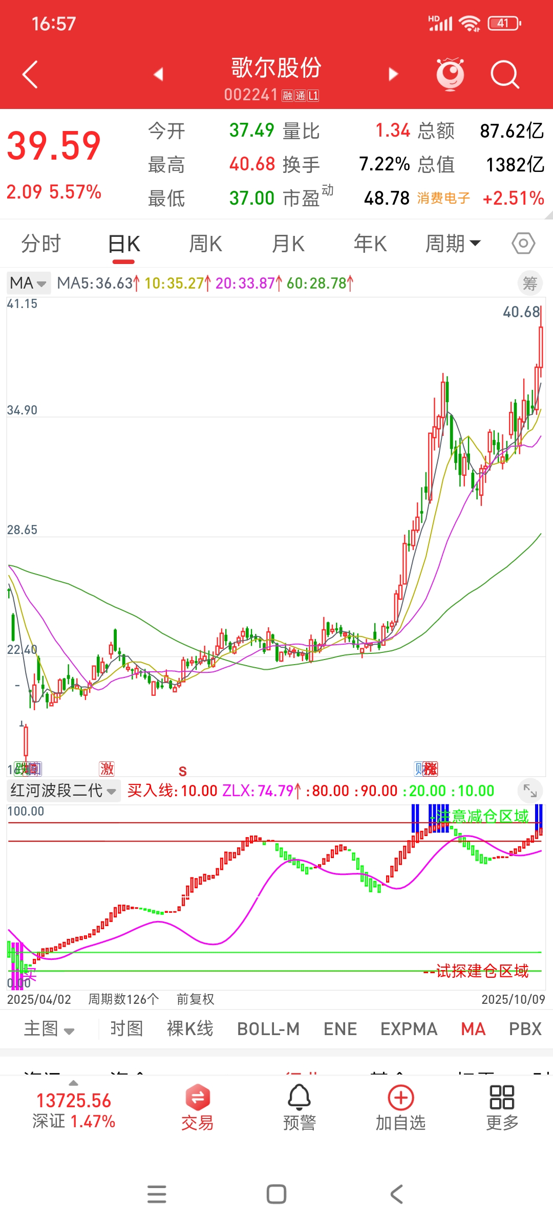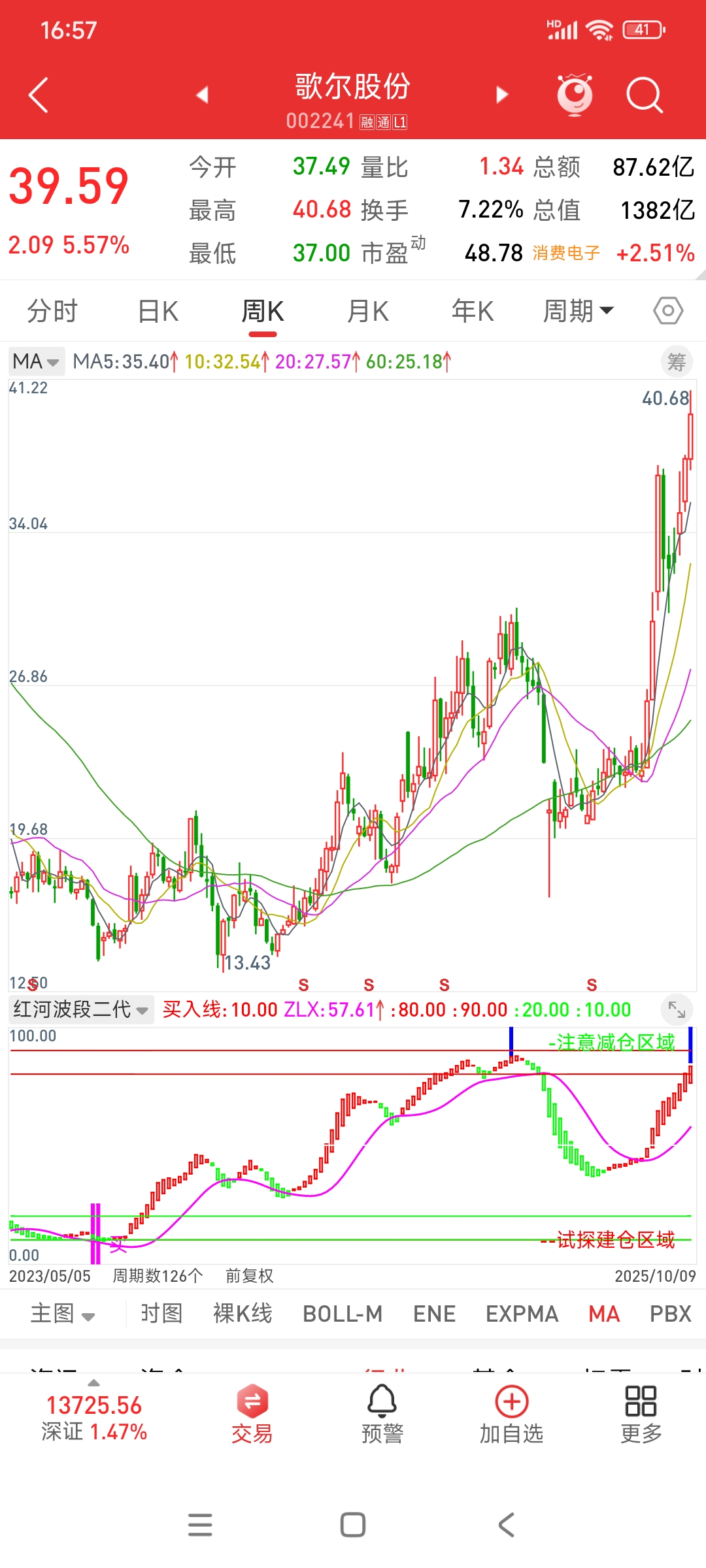 $歌尔股份(SZ002241)$  周线日线都是红柱延续,没有不上的理由,毕竟红柱不停,上涨不止,红柱拉长,加速不止,继续冲