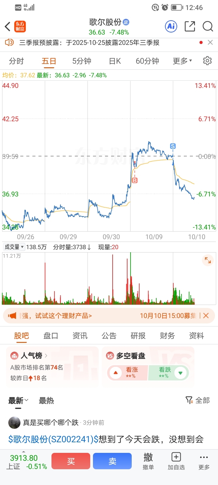 $歌尔股份(SZ002241)$ 交易原则,不够强势竞价就得砸,不然对不起自己的本金,以小试错