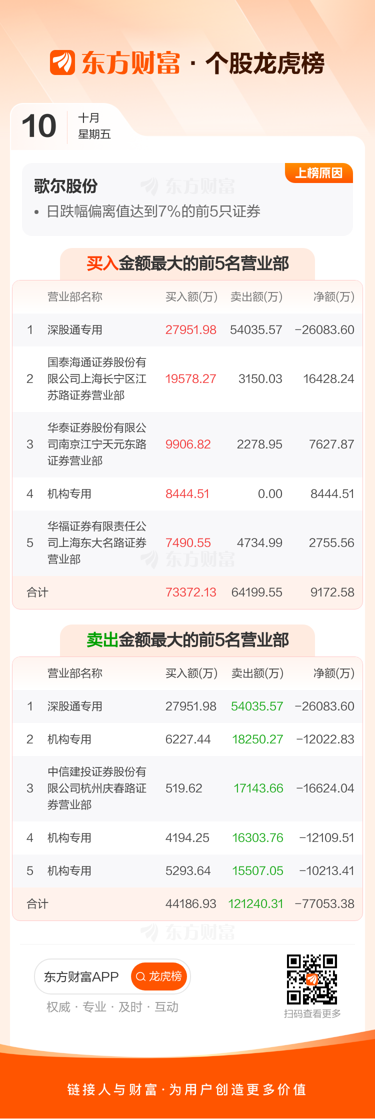 交易所2025年10月10日公布的交易公开信息显示,歌尔股份因成为日跌幅偏离值达到7%的前5只证券上榜。歌尔股份当日收报35.87元,涨跌幅-9.40%,偏离值-7.66%,换手率6.65%,成交额76.39亿。