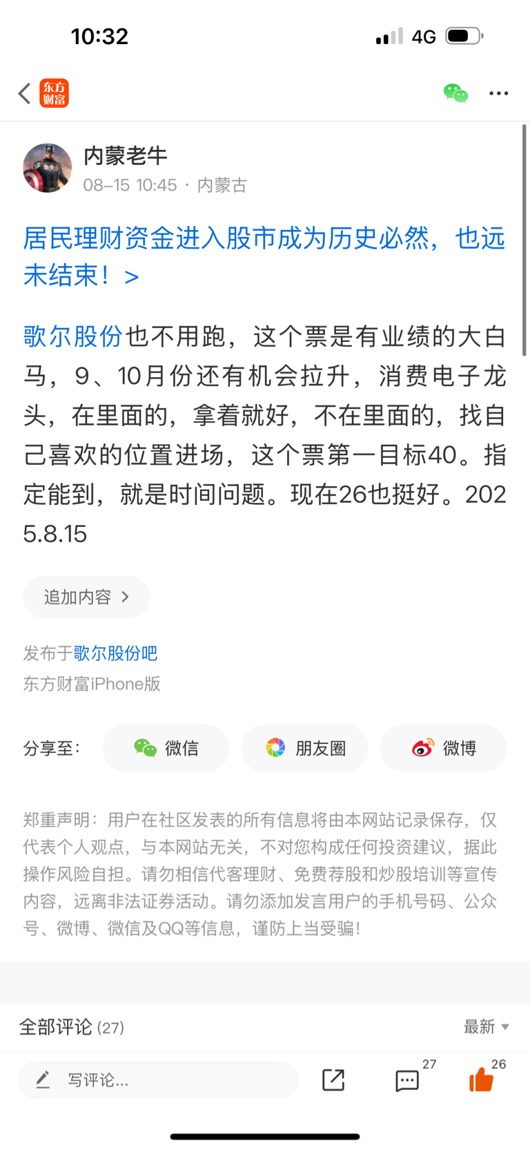 $歌尔股份(SZ002241)$ 歌尔股份继续吹牛,我8.15号告诉你们,第一目标40。9、10月份就能见到,有图有真相,我的所有帖子都没有删,对就是对,错就是错,我的所有帖子都有日期,自己翻的看。这两个月,在歌尔贴吧里,一直唱多的,还是坚持唱多的,基本只有我一个人,看看歌尔的热帖里,基本一半是我发言的帖子,能精准判断9、10月份。歌尔能到40的,只有我一个人,就这样的实力,要不要掌声搞起来,点赞搞起来。全市场这么多票,我只做自己熟悉的领域,我也是实盘操作,不是其他的那些网络大神,问啥都知道,啥行业,啥板块都了解...我准确的告诉你们,真正实盘操作的,真正有本事的,他只在自己熟悉的个别股票里来回做,也只是熟悉个别几个板块,不可能都了解的,当你360行都了解的情况下,不是神、就是骗子。好了,等3万粉丝时,我再继续给你们福利票吧。2025.10.9