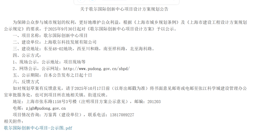 近日,上海市浦东新区人民政府官网发布了关于歌尔国际创新中心项目设计方案规划的公告。