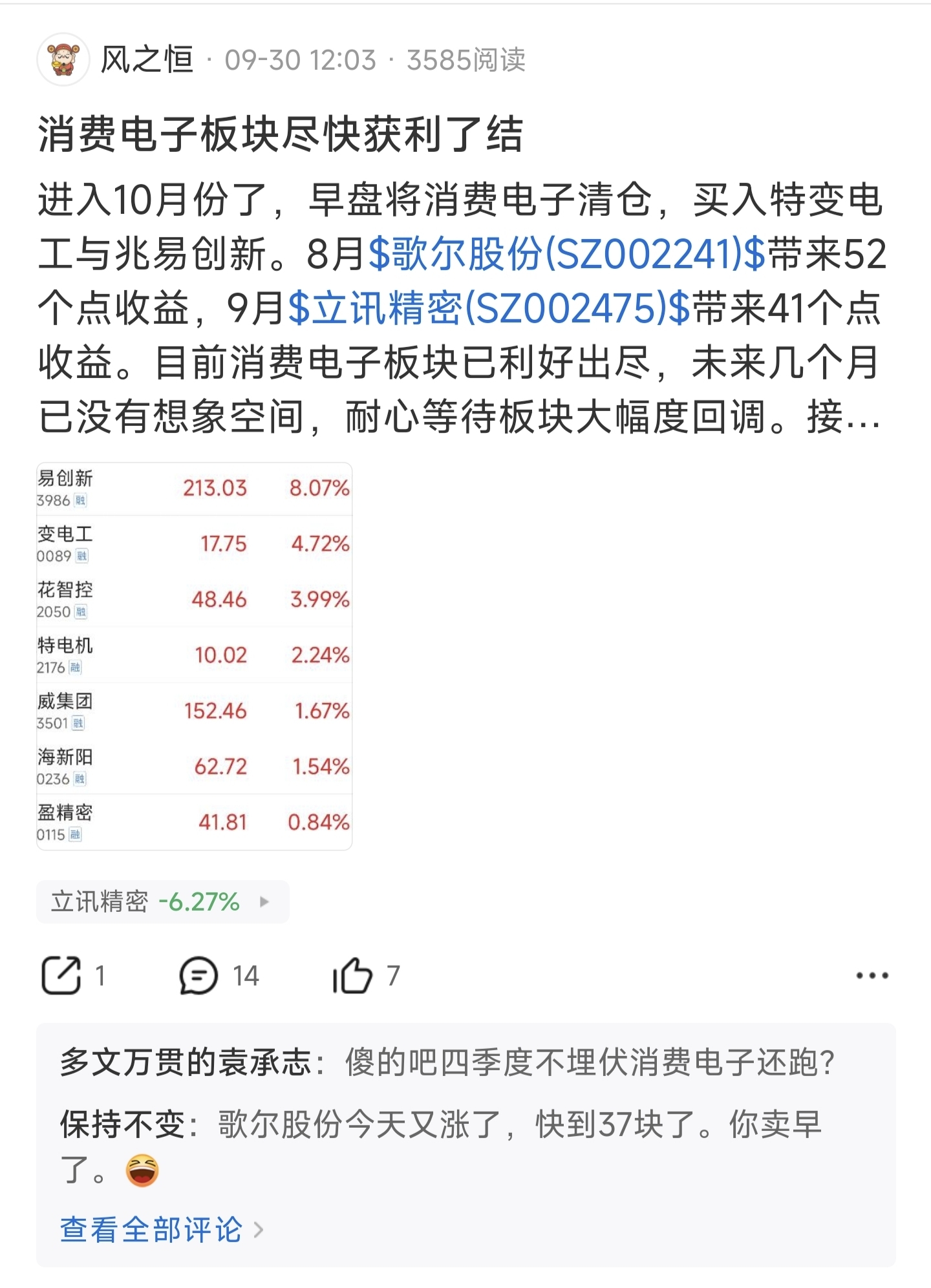 $歌尔股份(SZ002241)$ 没人比我更懂歌尔,9月30日在高点断言会回调到28元,当时还被一堆新韭菜嘲笑。歌尔的散户们不要过于伤心,赶紧跟我来$北方稀土(SH600111)$ 和 $XD江河集(SH601886)$ 吃肉