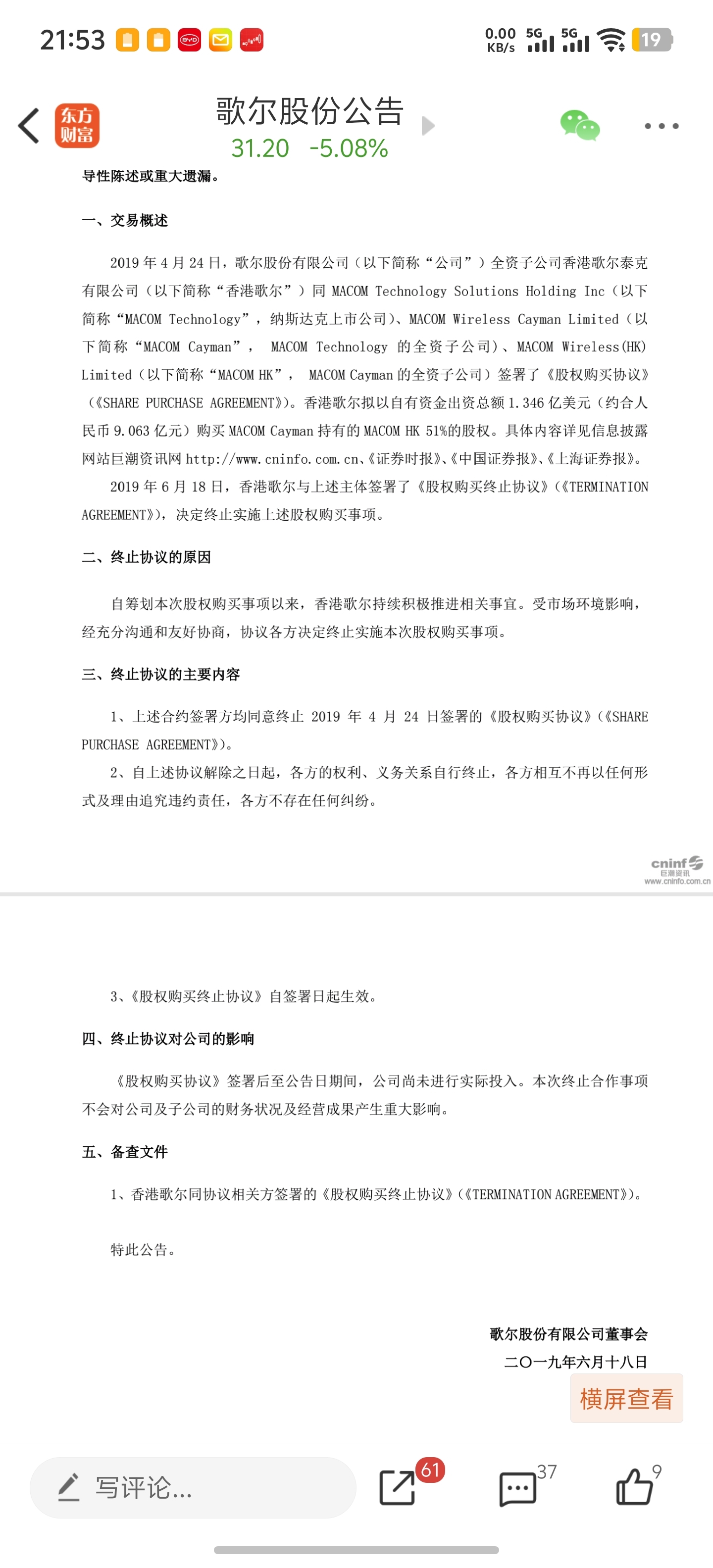 刚刚查资料追溯前面歌尔在2019.6.17晚间也同样有一份股权收购终止协议在6.