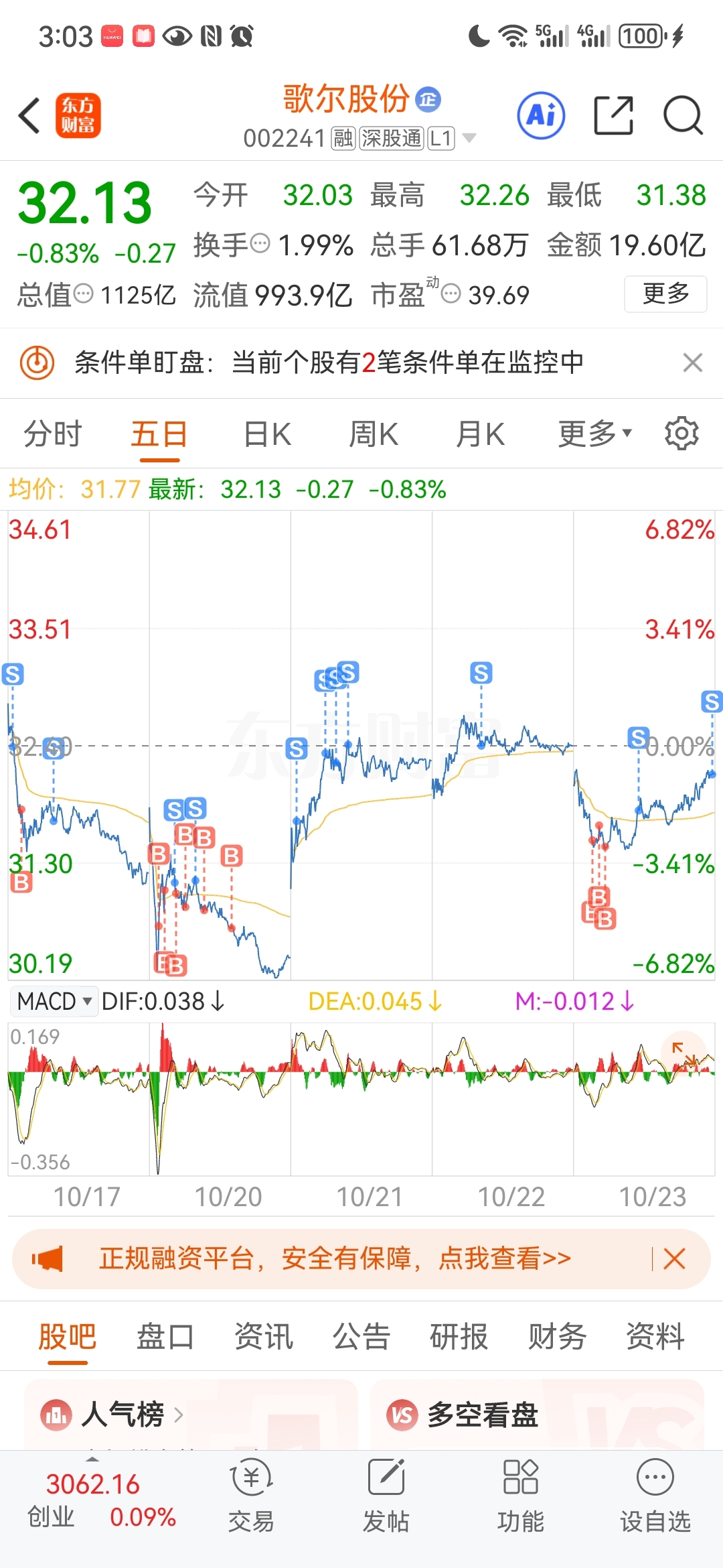 没想到今天一天都没红一下,不过还好的是不管涨跌严格按计划执行,今天做T收盘歌尔是