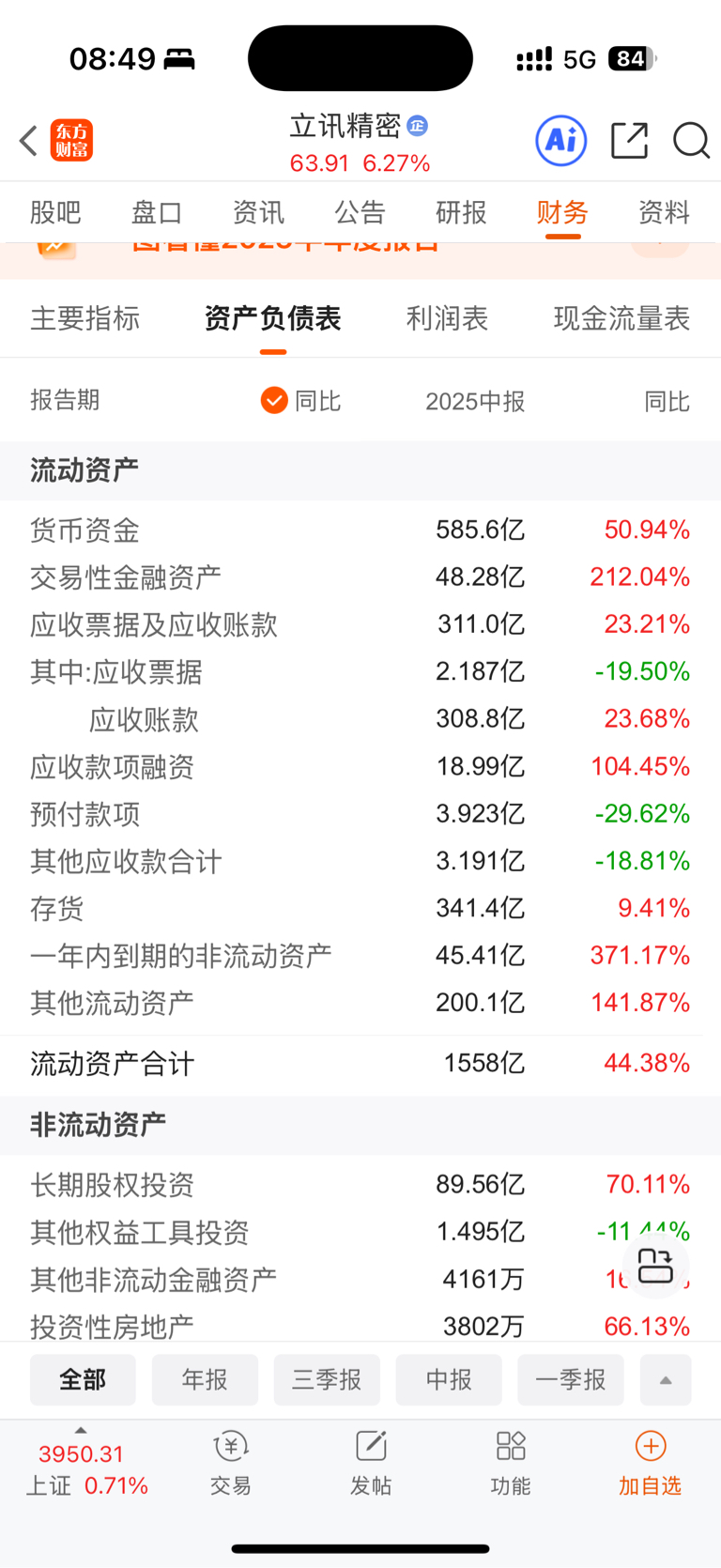 立讯精密Y25Q2资产负债表显示,货币资金585.6亿元,短期借款558.4亿元