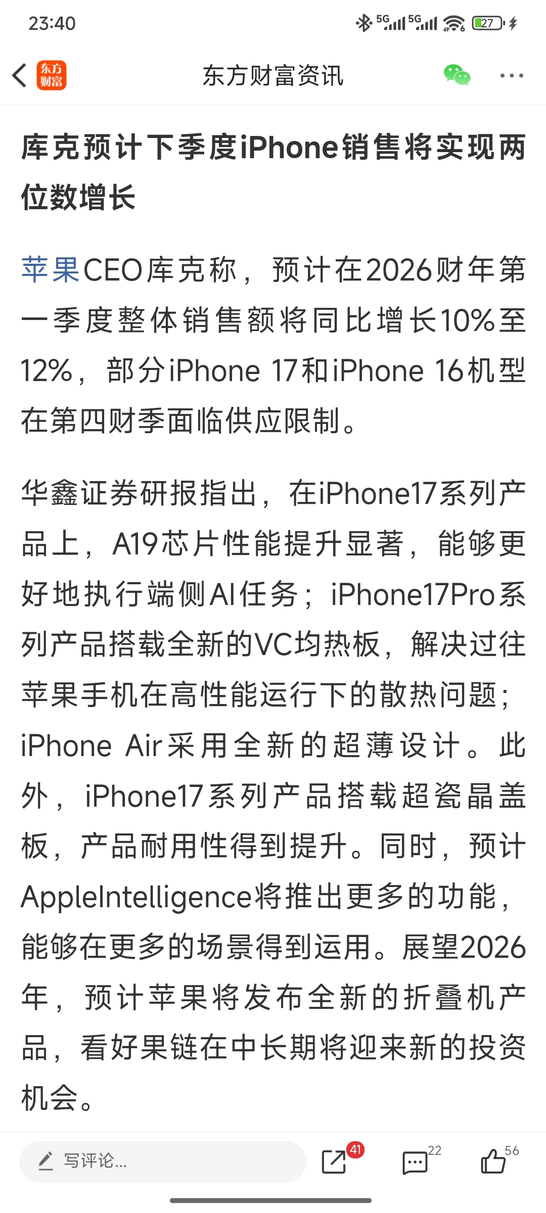 库克预计下季度iPhone销售将实现两位数增长苹果CEO库克称,预计在2026财