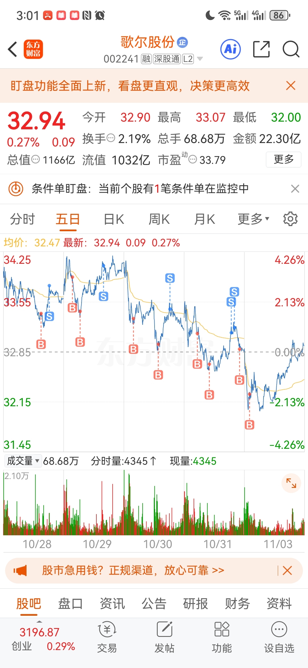 $歌尔股份(SZ002241)$ 今天继续加仓,下午在33.06犹豫要不要卖出做个T,考虑了一下预估今天收盘32.90以上收红盘,就没打算卖出来了,没想到能砸到32.7毛多,早知道能砸一个点就做个T了。