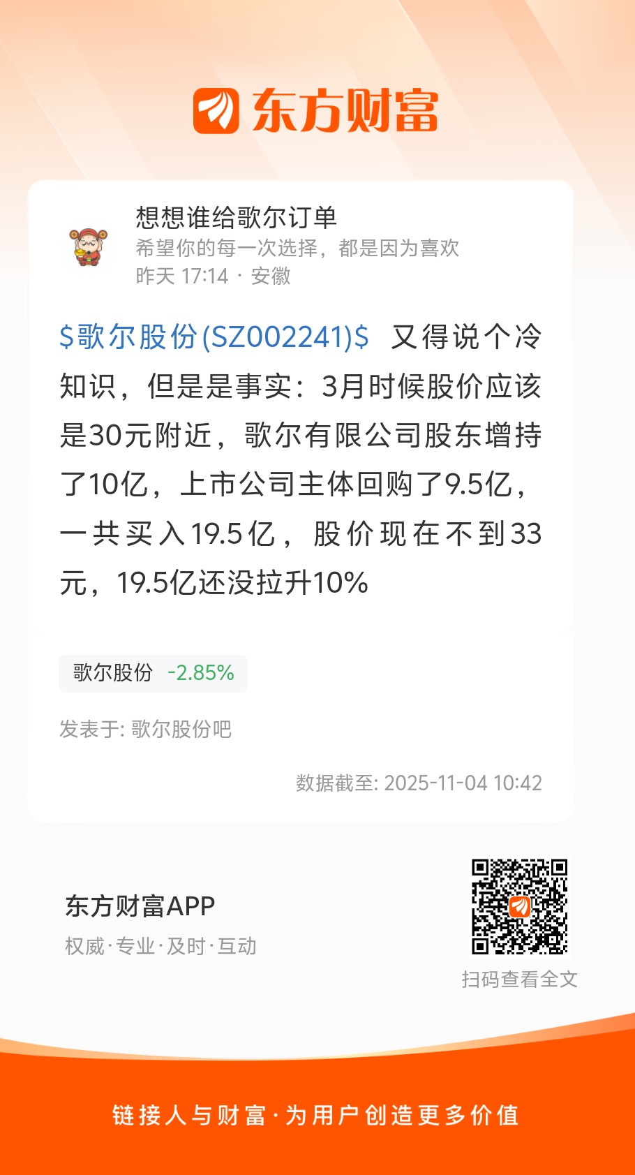 $歌尔股份(SZ002241)$ 又得说个冷知识,但是是事实:3月时候股价应该是30元附近,歌尔有限公司股东增持了10亿,上市公司主体回购了9.5亿,一共买入19.5亿,股价现在不到33元,19.5亿还没拉升10%