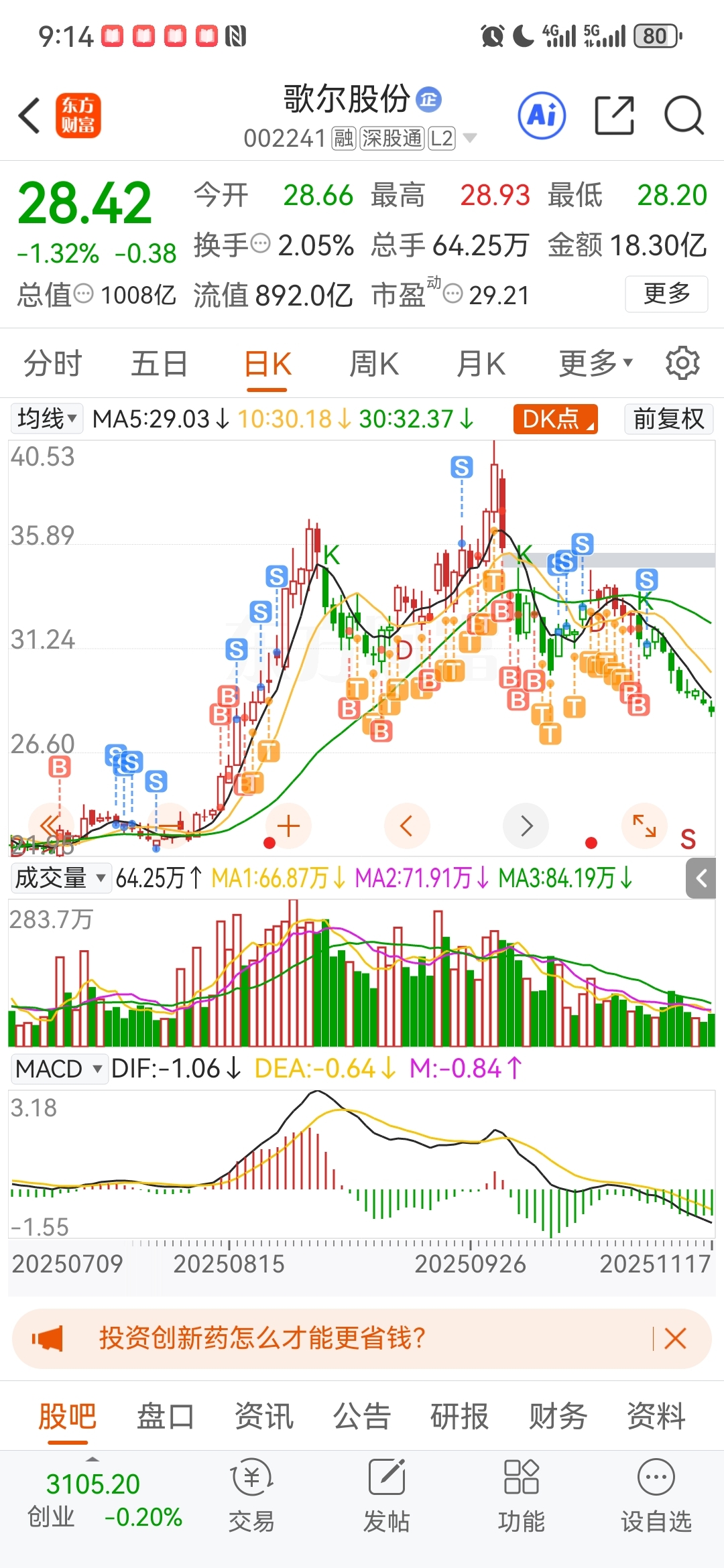 $歌尔股份(SZ002241)$ 本来不想发帖的,毕竟我已经清仓了。看到好多散户朋友被跌怕了,或者被一些唱空的吓坏了还是说一下吧。目前确实是下跌趋势中,下跌不言底,我也不敢说什么时候能企稳。按我今天四次清仓歌尔四次盈利出来,给大家一点点信心。下跌大概率也就25—28这个范围了,大家根据自己情况有能力的就做做T,没能力的就分批次加点仓,我这边计划28以下择机建仓,注意只是建仓不是全仓。大家加油!