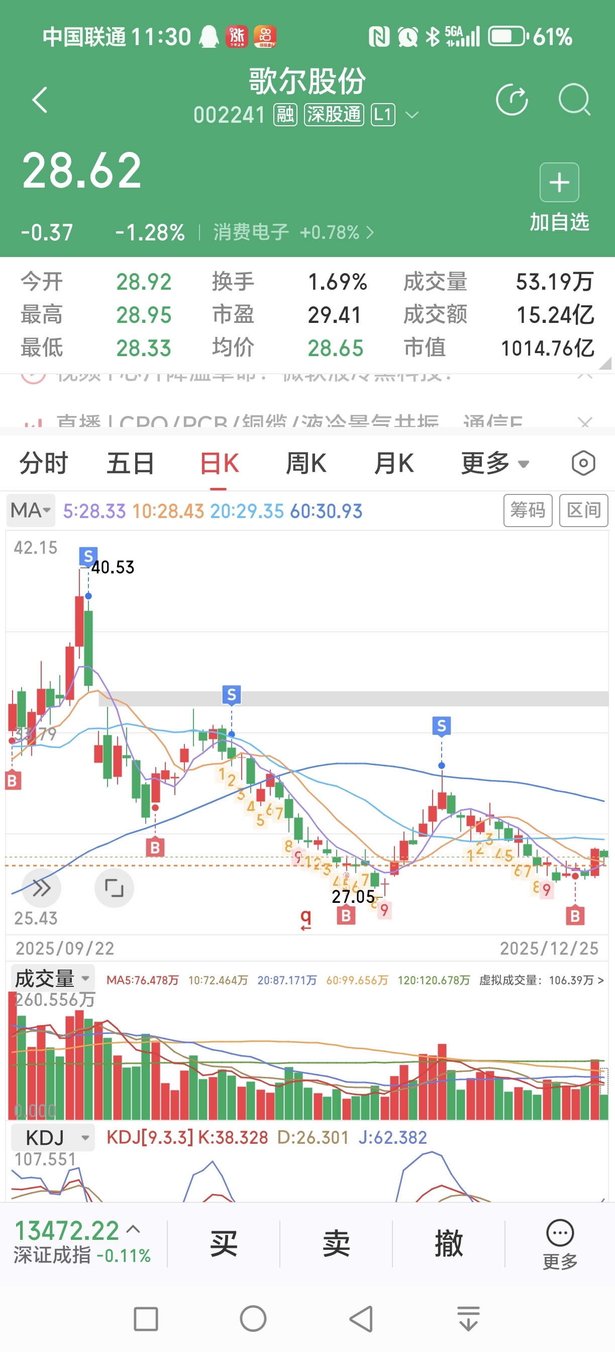 $歌尔股份(SZ002241)$ 午盘已休盘,当前成交额15.24亿 整天预估接近昨日成交额,。开盘一度抛压触碰5/10日均线。现资金有回流现象,如:下午2.30-3点之间,翻红可以加仓,跌幅不加仓需等待。目前走势良好,暂时不动。