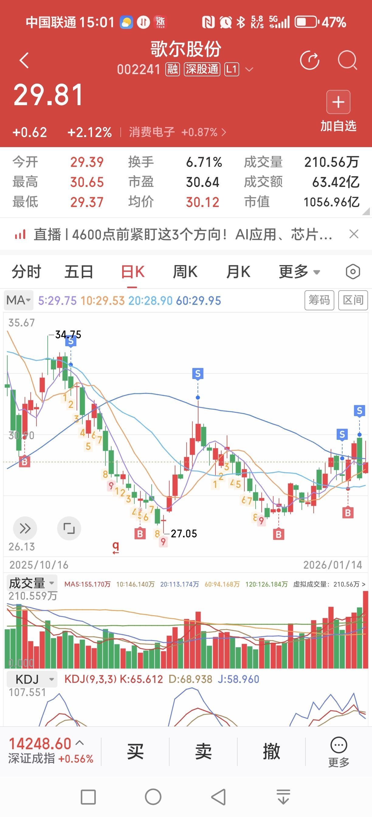 今日未跟盘,歌尔空仓中……60日均线压力还是蛮大的,还是两种操作等冲上60日回调