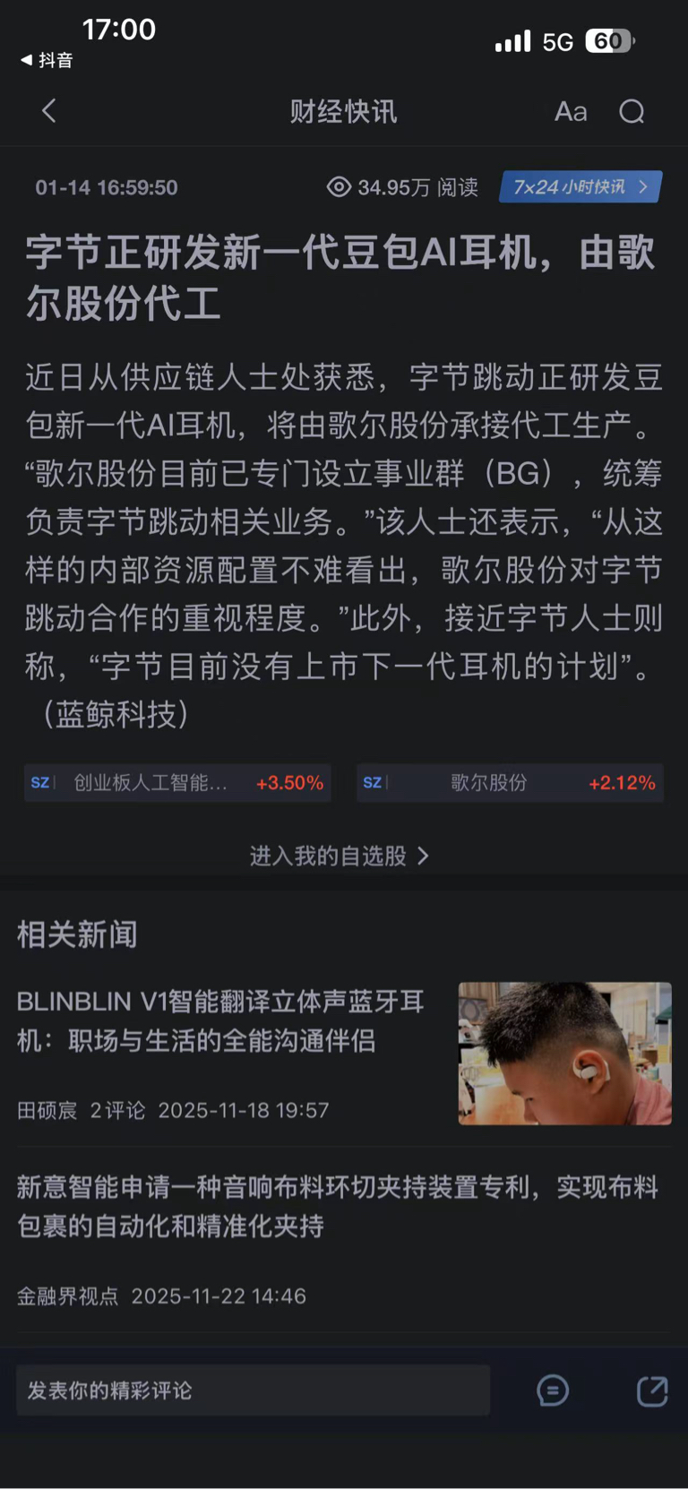 $歌尔股份(SZ002241)$ 豆包Ai耳机,歌尔股份代工。猪力加油,好人一生平安