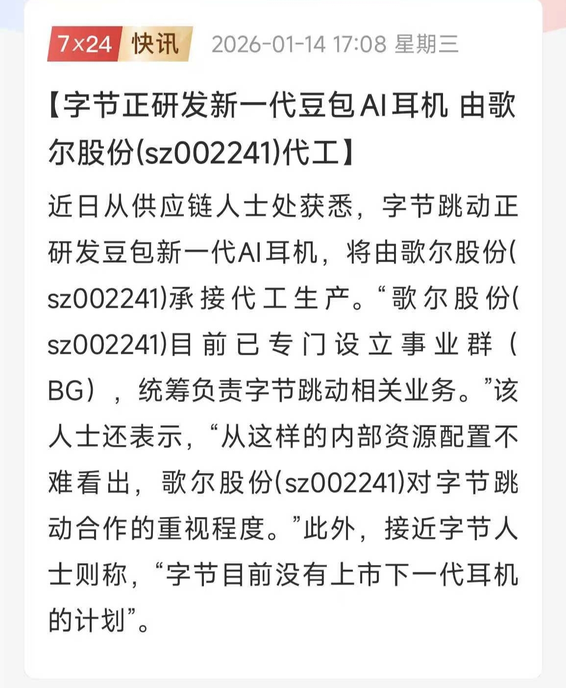 $歌尔股份(SZ002241)$ 先是META订单量翻4倍,现在超级大厂字节最新产品订单来了,不要着急,每天2个点,涨不停,不停涨。