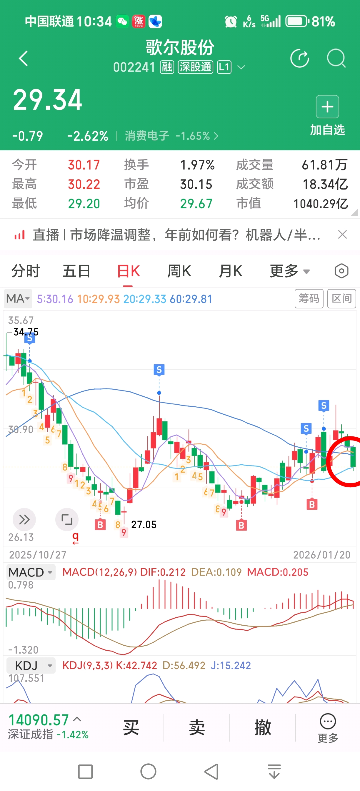 $歌尔股份(SZ002241)$ 多条均线支撑变压力,唯独20日均线还在支撑,不操作,等机会,