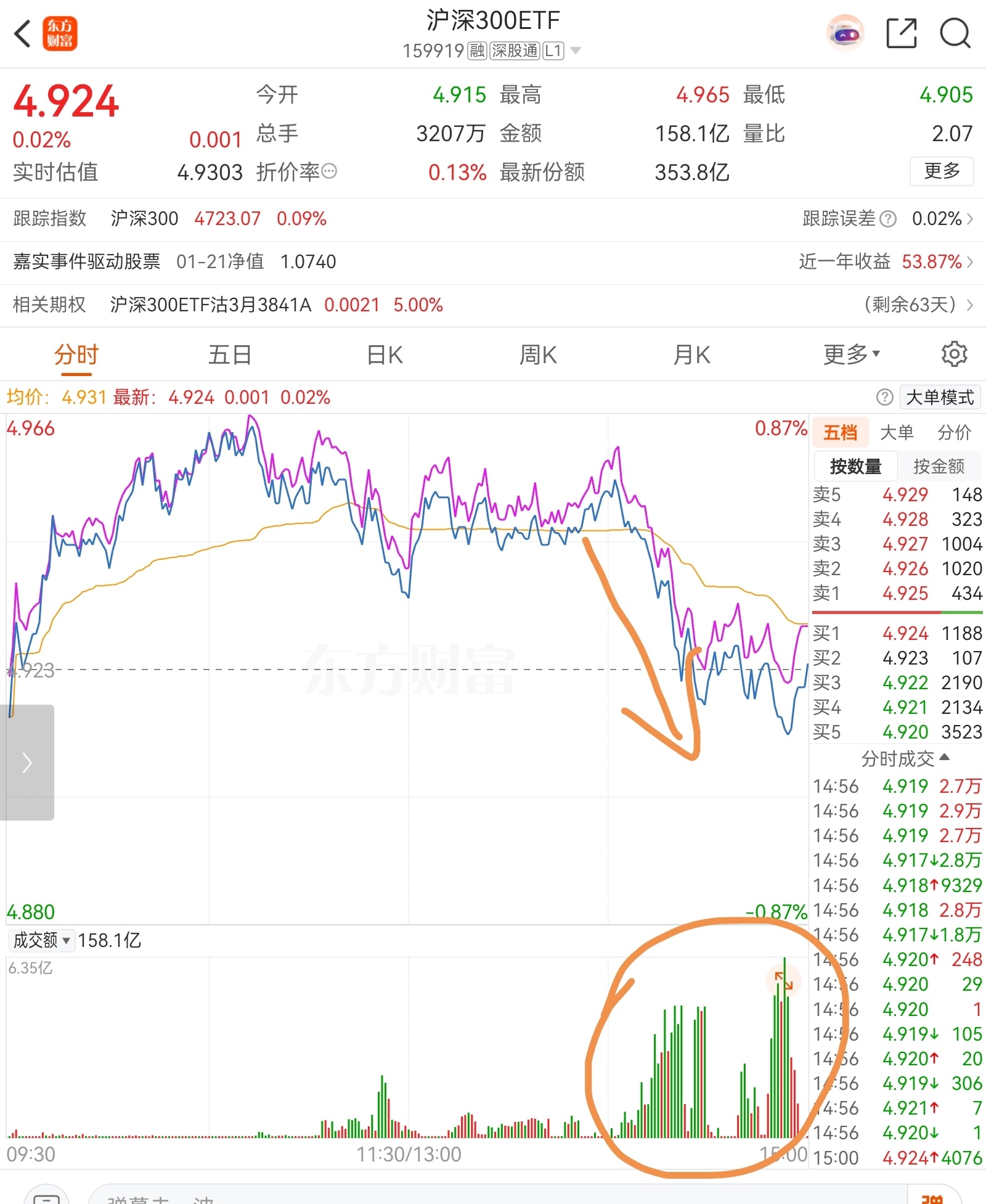 $歌尔股份(SZ002241)$ 在尾盘最后1小时,沪深300ETF下跌快速,爆发出巨大的交易量。分析是汪汪队低价卖,自己低价接,控大A指数,主力筹码没有出逃。安心持仓,歌尔也是被主力瞧上的票。。。。