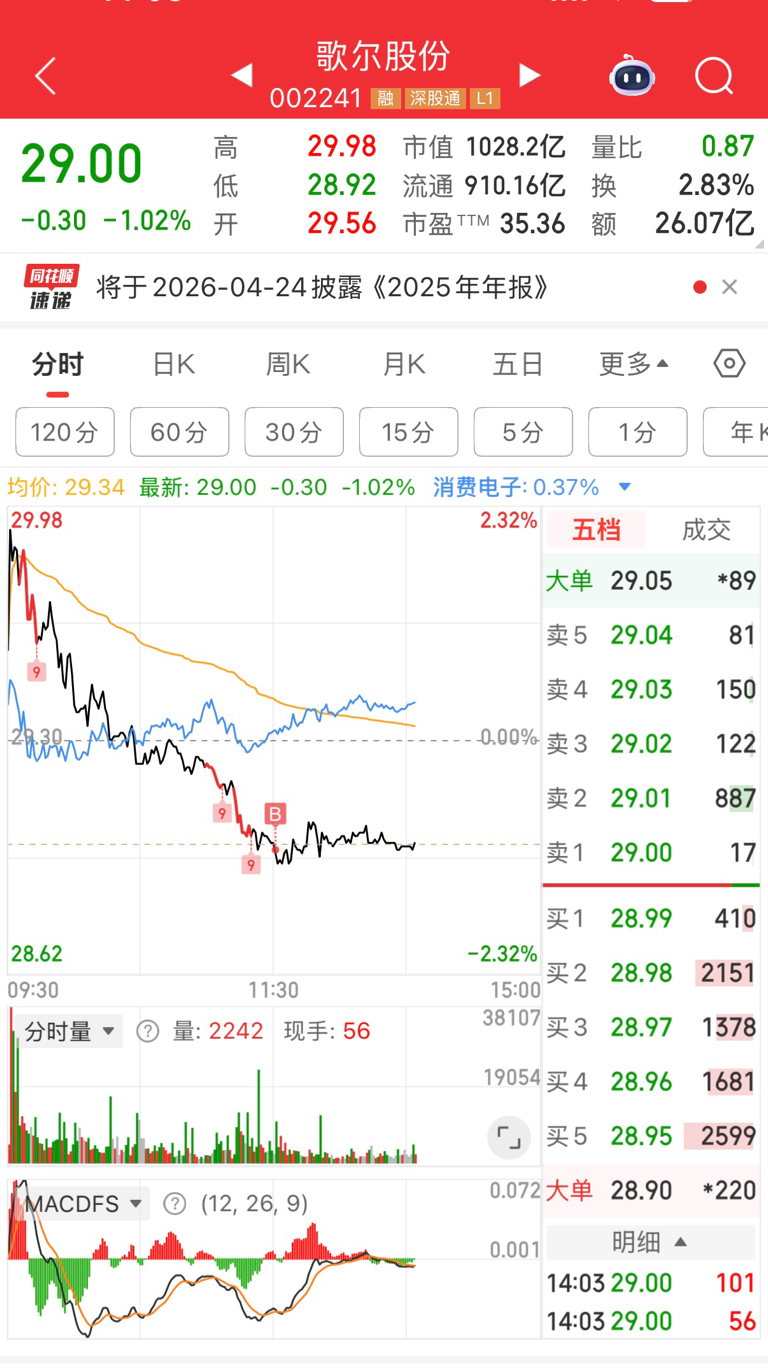 $歌尔股份(SZ002241)$ 古稀之年迈老人,快不得。大盘4110点买的28.97,现在大盘4122点,歌尔涨到29