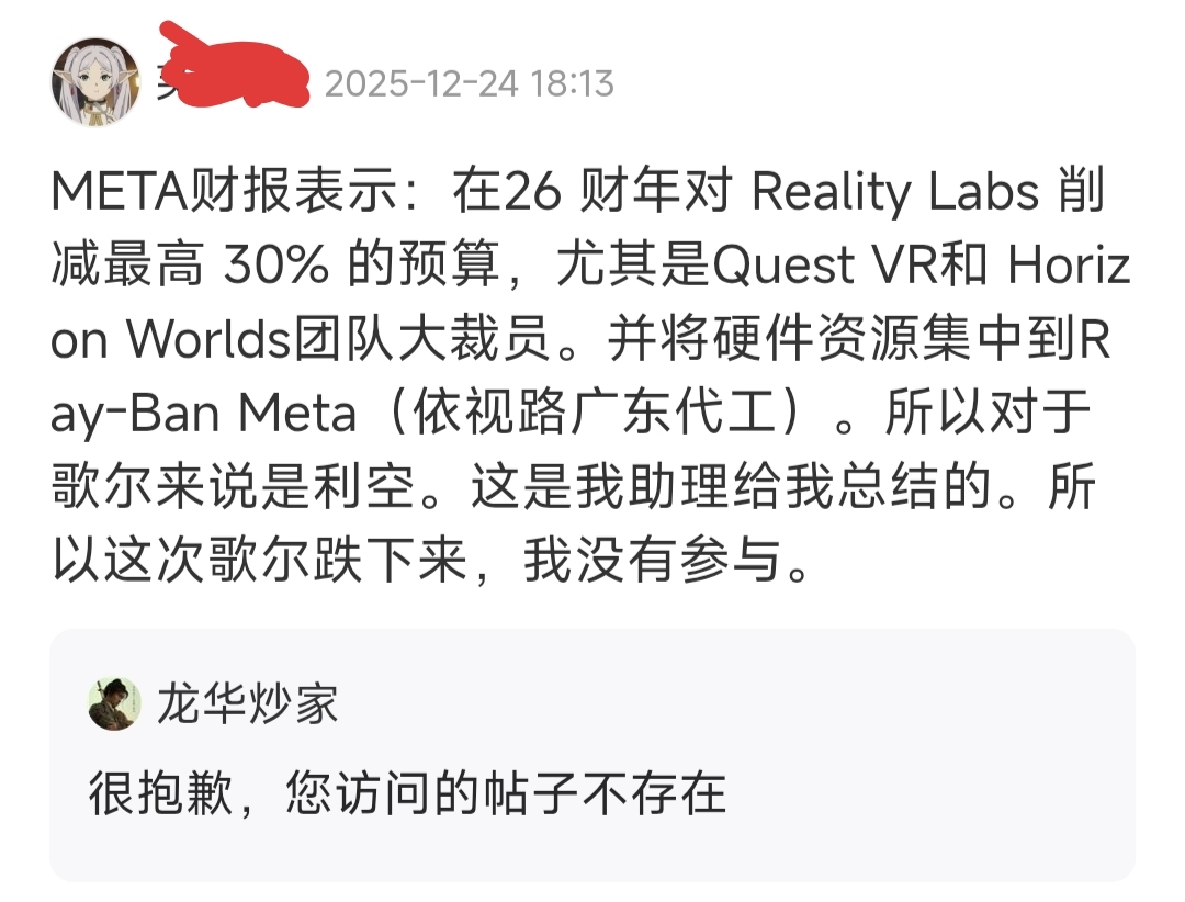 看看一个月前吧里牛散的总结。有人说歌尔砍单,裁员。meta一个月前就减预算要裁员
