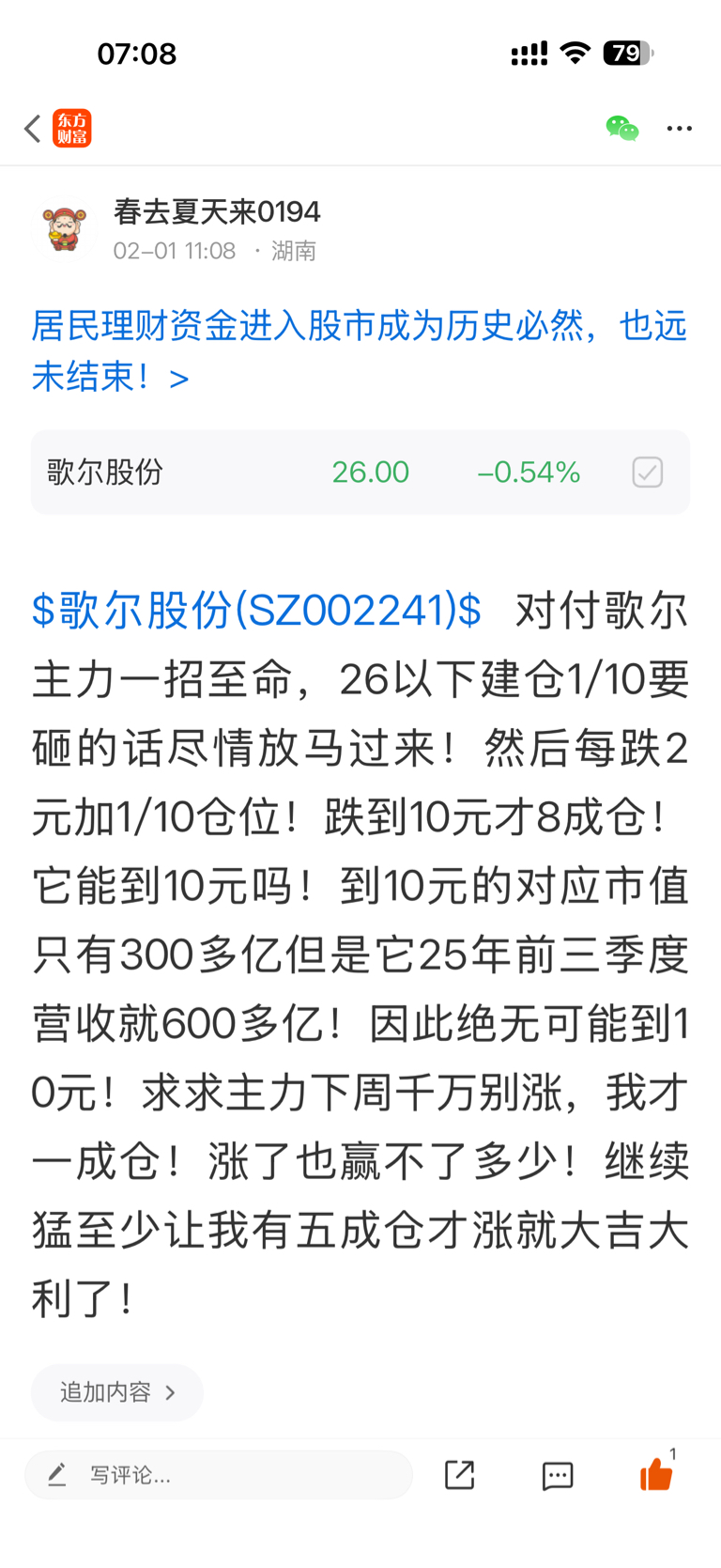 温馨提示: 1.根据《证券法》规定,禁止编造、传播虚假信息或者误导性信息,扰乱证券市场;2.用户在本社区发表的所有资料、言论等仅代表个人观点,与本网站立场无关,不对您构成任何投资建议。用户应基于自己的独立判断,自行决定证券投资并承担相应风险。《东方财富社区管理规定》