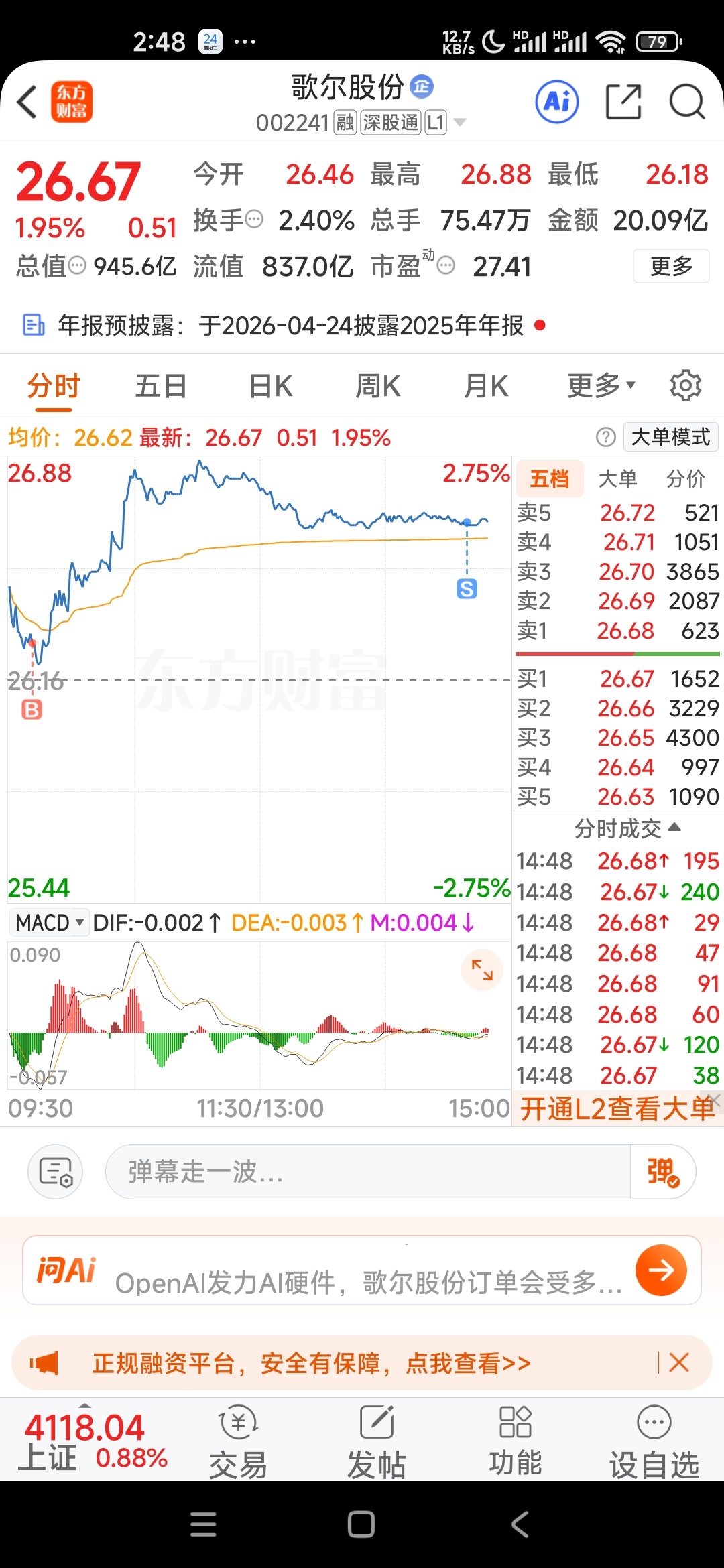 $歌尔股份(SZ002241)$ 早盘26.28加仓了,能不能长脸一次呀?持股39天,天天绿,新年第一天