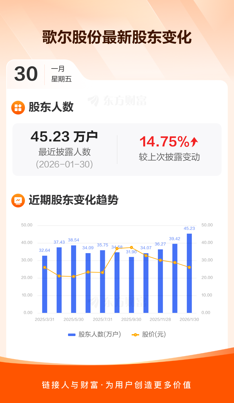 歌尔股份:截至1月30日最新股东户数45.23万户,较上期增加14.75%