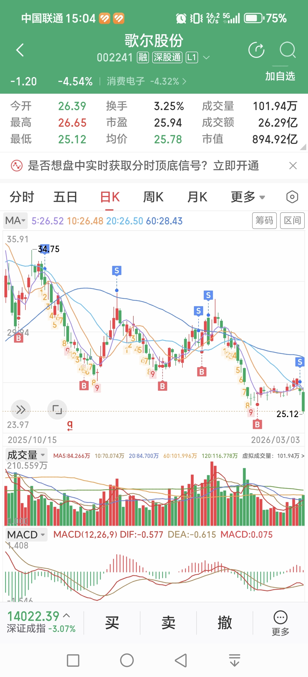 $歌尔股份(SZ002241)$ 今日放量下跌,成交额26.28亿,支撑线已破,考虑到60日均线未能触碰。这波操作失败总收益1.13%。 下次有望触碰60均线,期待吧。今日未操作空仓中……,