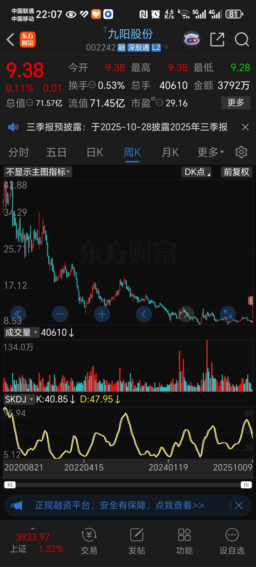 $九阳股份(SZ002242)$ 9.1 , 8.9各加仓一次,如果8.9给机会加仓后边就不加了,好股拿长线。学历低不了解,不懂科技,不想高位做接盘侠,珠海港高位做了接盘侠被套了八年