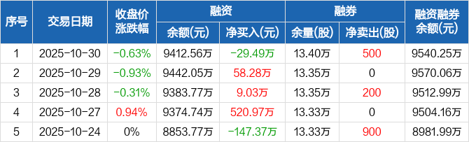 九阳股份:融资净偿还29.49万元,融资余额9412.56万元(10-30)