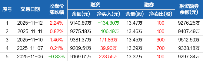 九阳股份:融资净偿还134.3万元,融资余额9140.89万元(11-12)