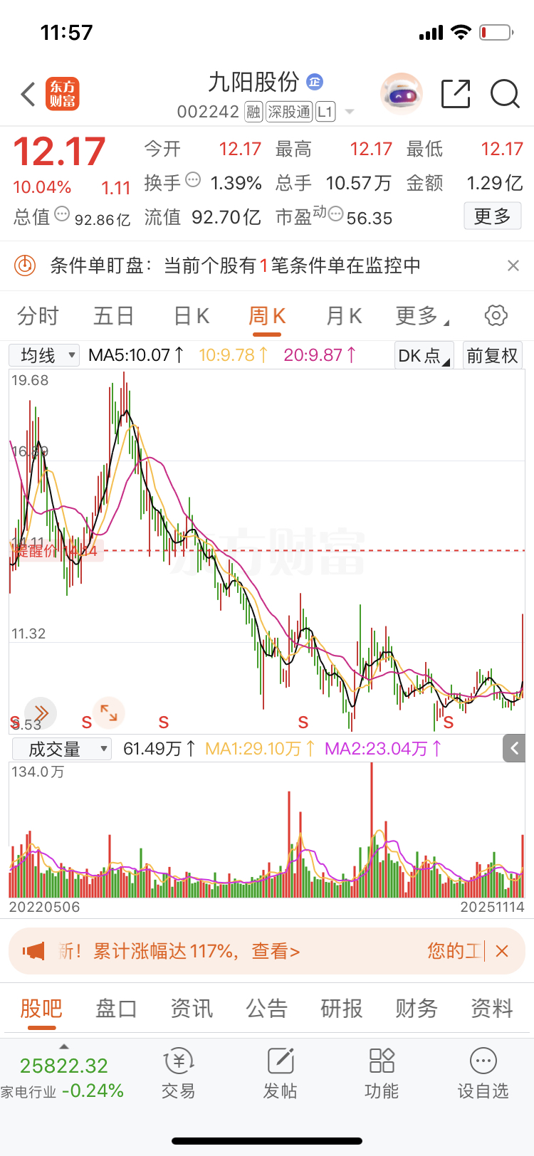$九阳股份(SZ002242)$ 反弹至14.14元左右密集套牢区清仓