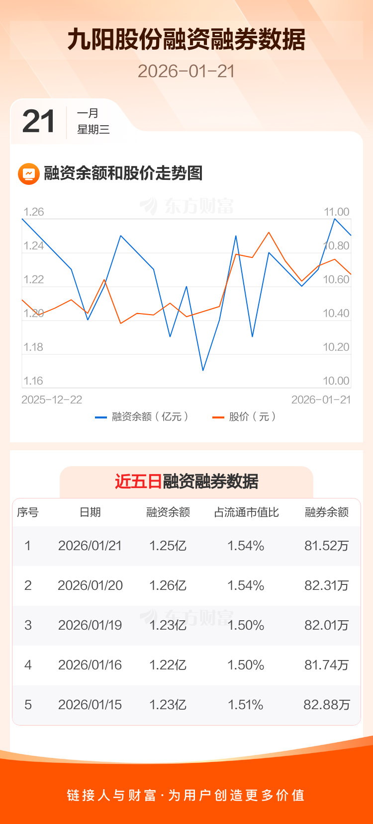 交易所最新数据显示,九阳股份于2026年1月21日获融资买入713.77万元,融资偿还863.44万元,当日融资净偿还149.67万元。目前,该股融资余额1.25亿,占流通市值比例为1.54%。