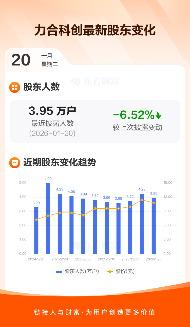 力合科创最新披露数据显示,截至1月20日公司股东户数为3.95万户,较上期(2026年1月9日)减少2756户,降幅为6.52%。户均持有流通股数量由上期的2.85万股上升至3.05万股,户均持股金额由上期的32.49万元增加至32.84万元。