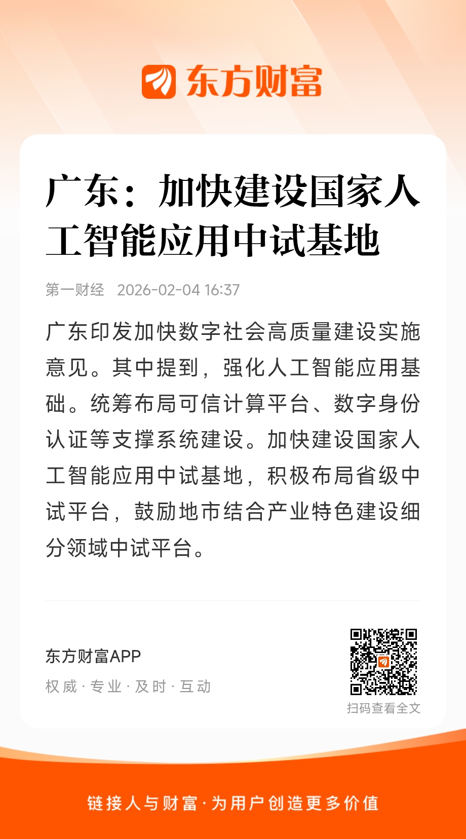 广东印发加快数字社会高质量建设实施意见。其中提到,强化人工智能应用基础。统筹布局可信计算平台、数字身份认证等支撑系统建设。加快建设国家人工智能应用中试基地,积极布局省级中试平台,鼓励地市结合产业特色建设细分领域中试平台。推动人工智能业务中台与行业应用共性平台建设,打造人工智能应用服务链,深入挖掘具身智能体等技术应用场景。