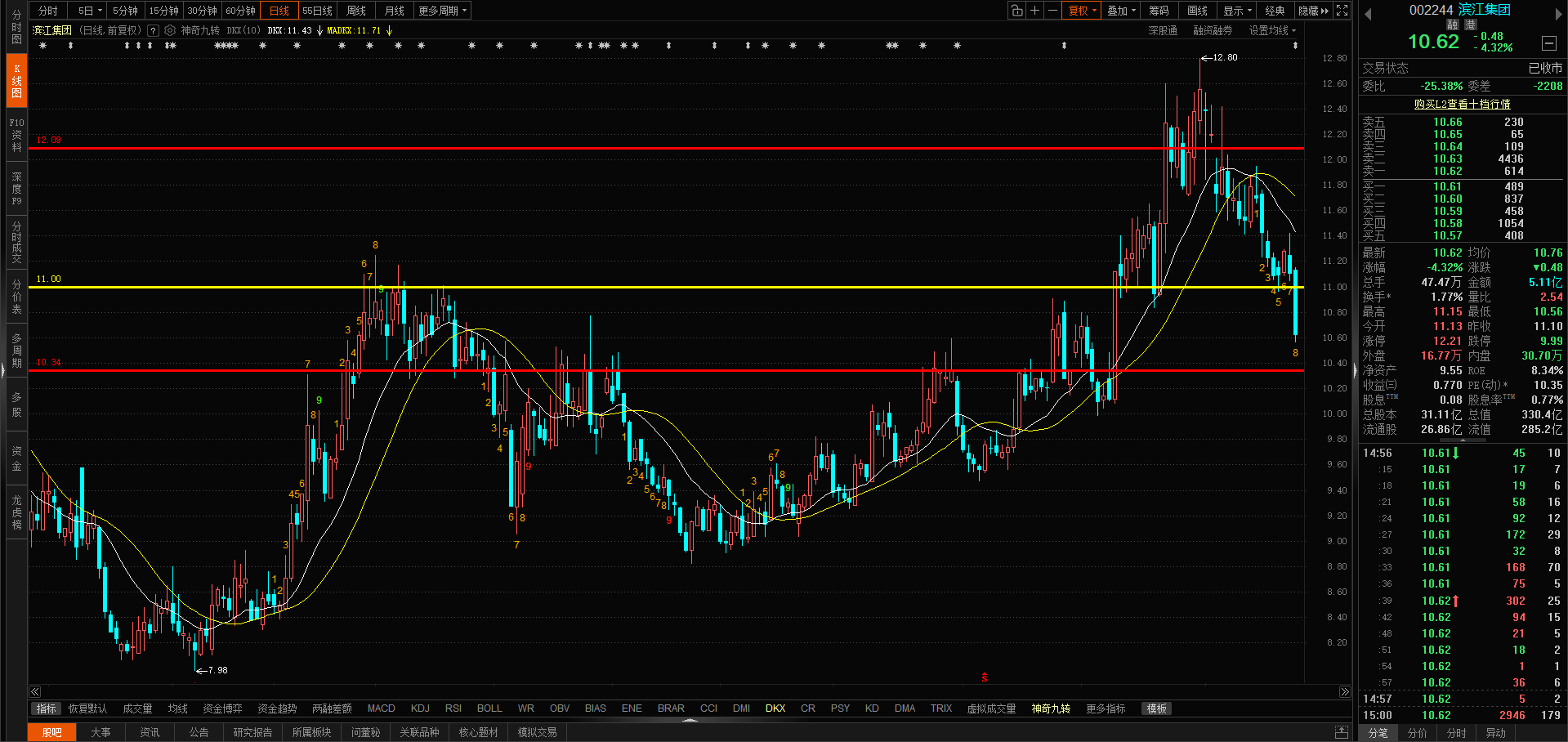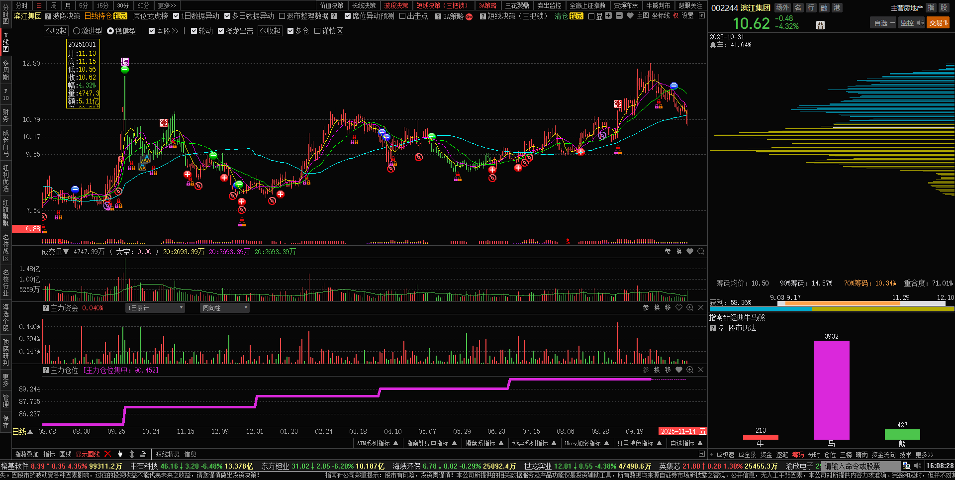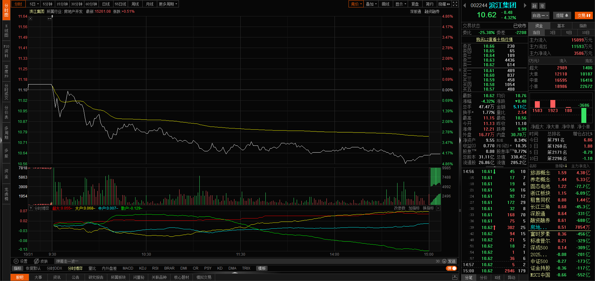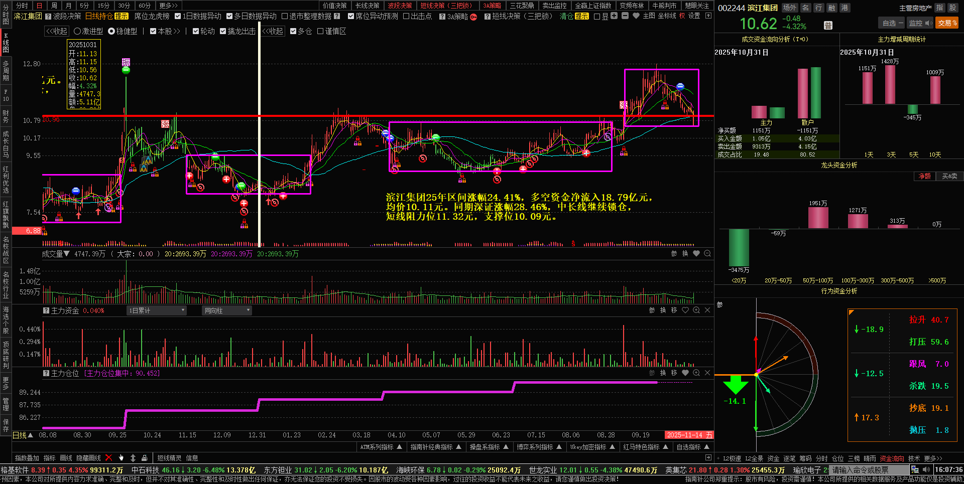 滨江优质好股,三季报公告出来显示主力机构仓位集中度90.452,今日主力刻意打压低吸,全天主力资金净流入1151万元(东方财富软件显示主力资金净流入3506万元),量能开始放大,换手率1.77%,跌幅4.32%,收盘价10.62元,短线支撑位10.50元,强支撑10.09元,压力位11.32元,下周有望探底回升。守住底仓不动摇,保持好心态。