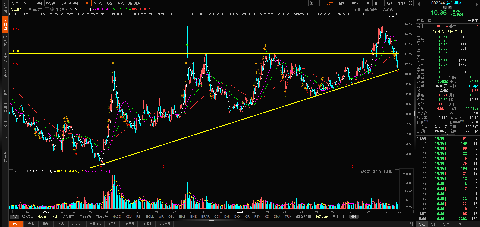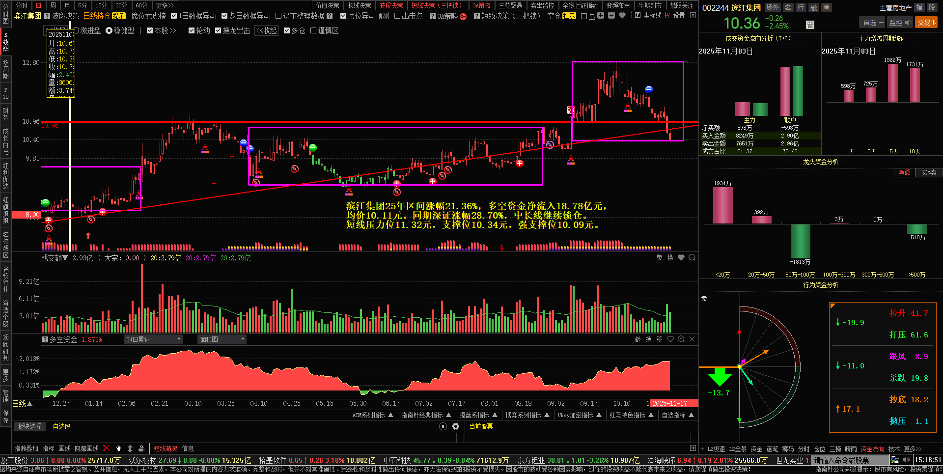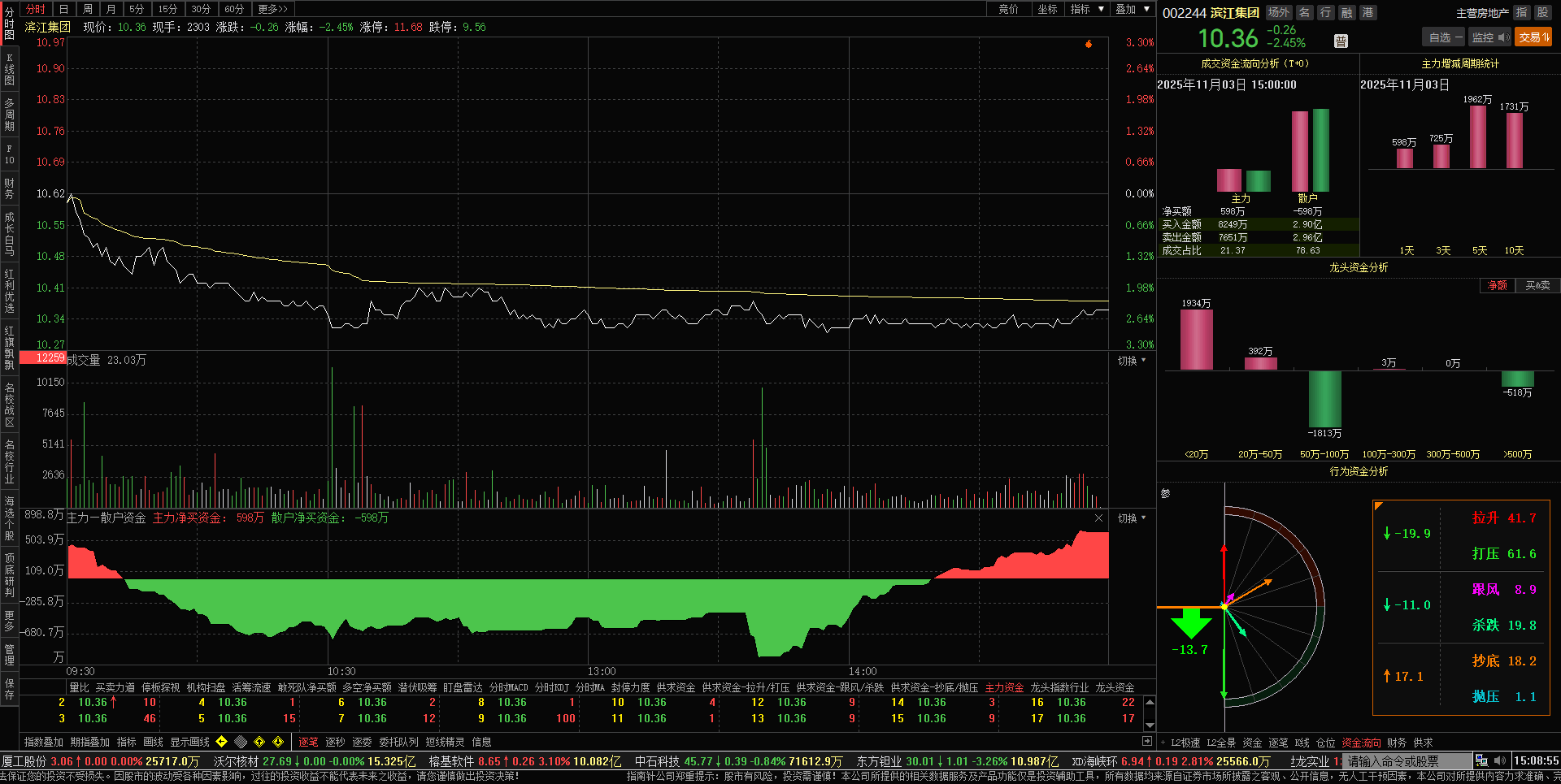 今日滨江主力低价压盘获取廉价筹码,换手率1.34%,跌幅2.45%,收盘价11.