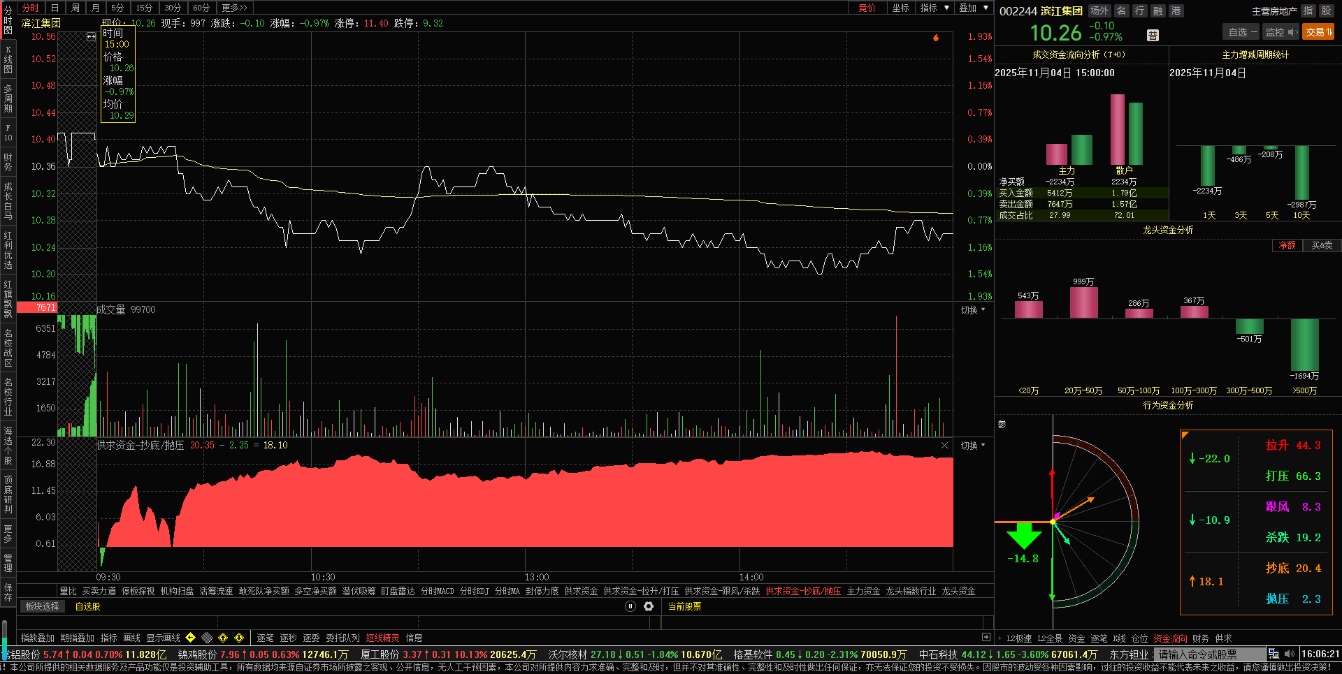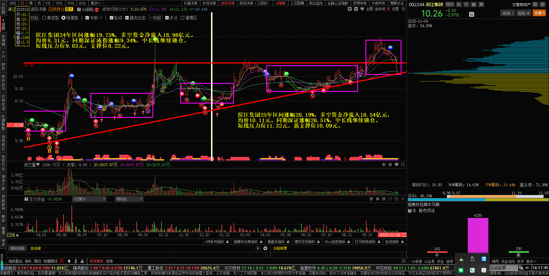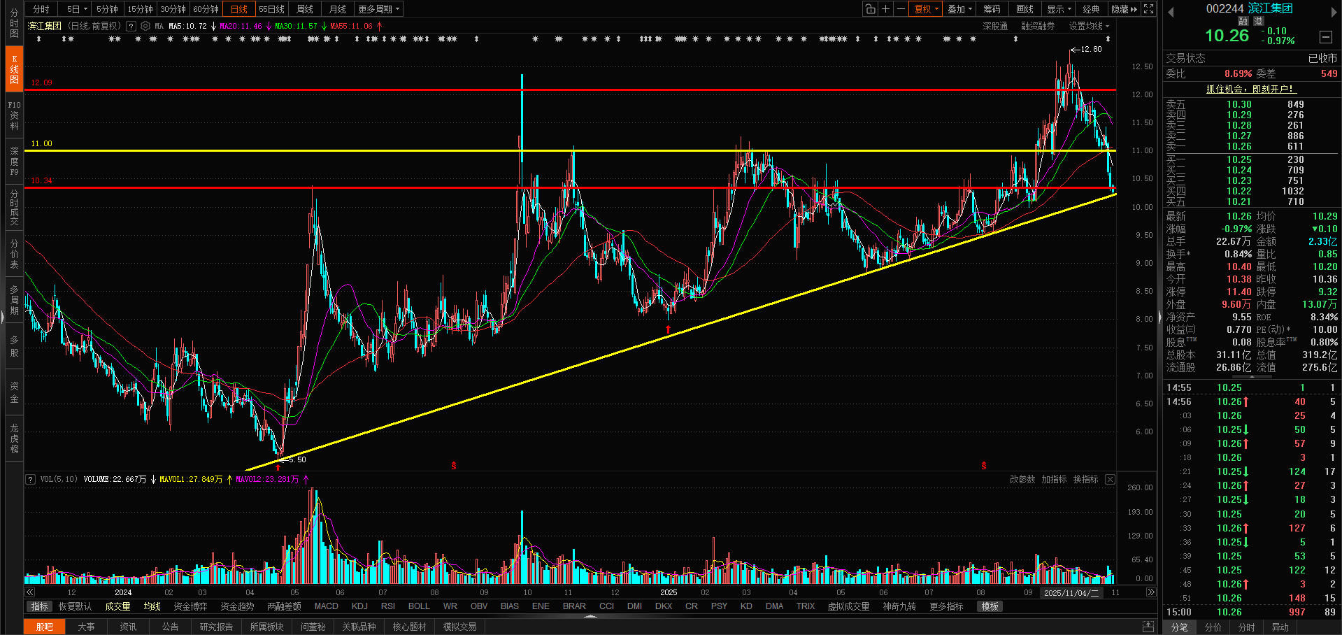 滨江集团调整基本到位,再跌就是超低了,5.50上来的趋势线在10.10左右。看好优质滨江,继续锁仓做T。保持好心态,今日10.40卖出,最低10.21买回。明天10.10以下准备加仓!