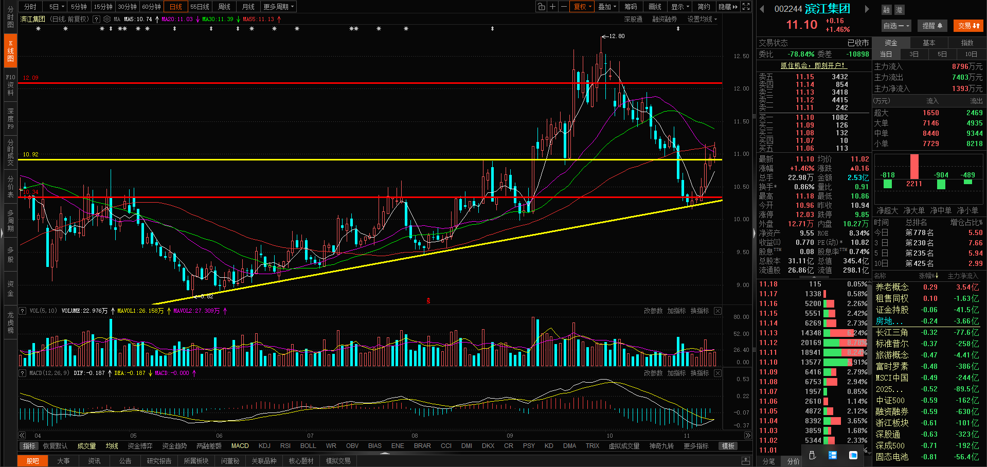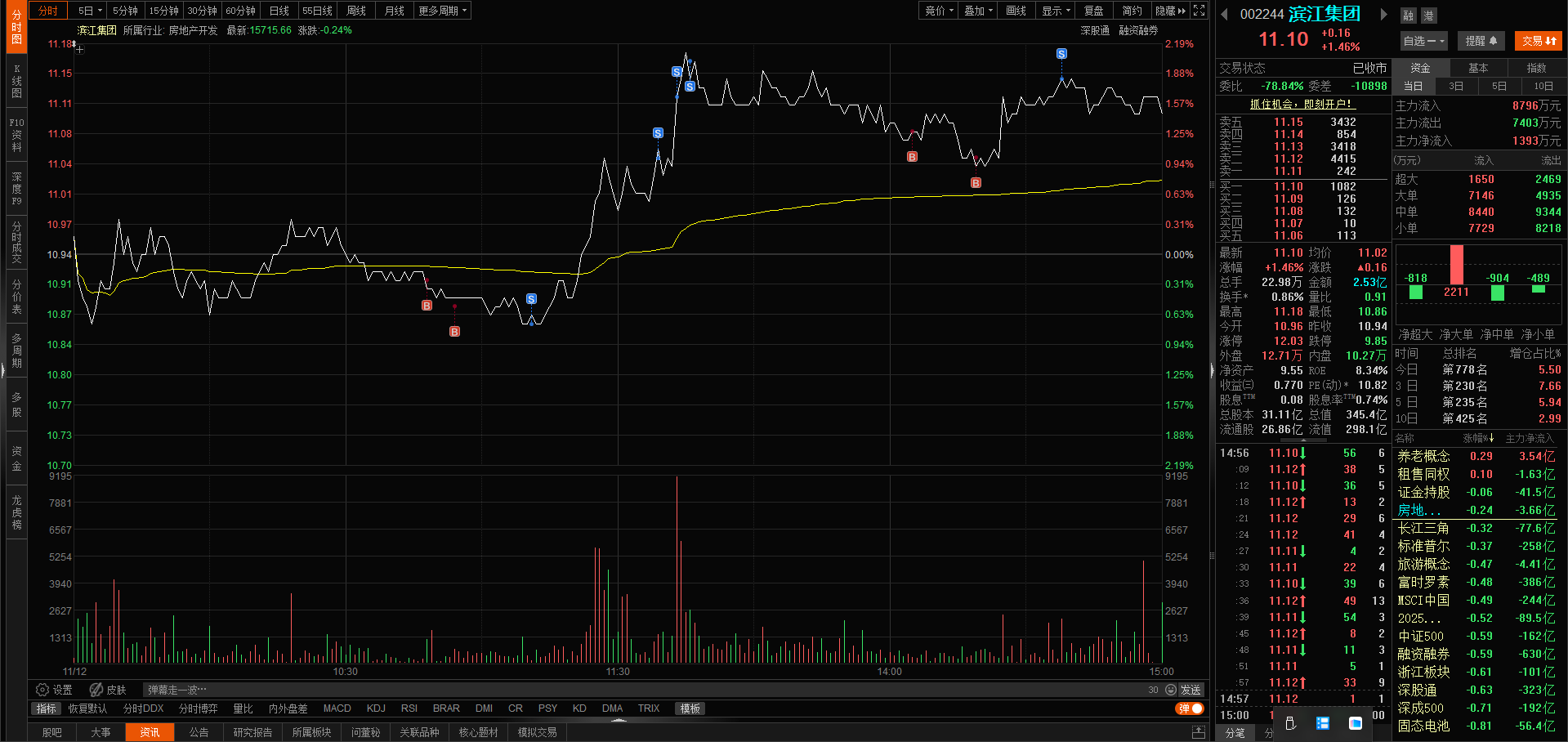今日滨江延续缩量反弹,换手率0.86%,涨幅1.46%,多空资金净流入1994万