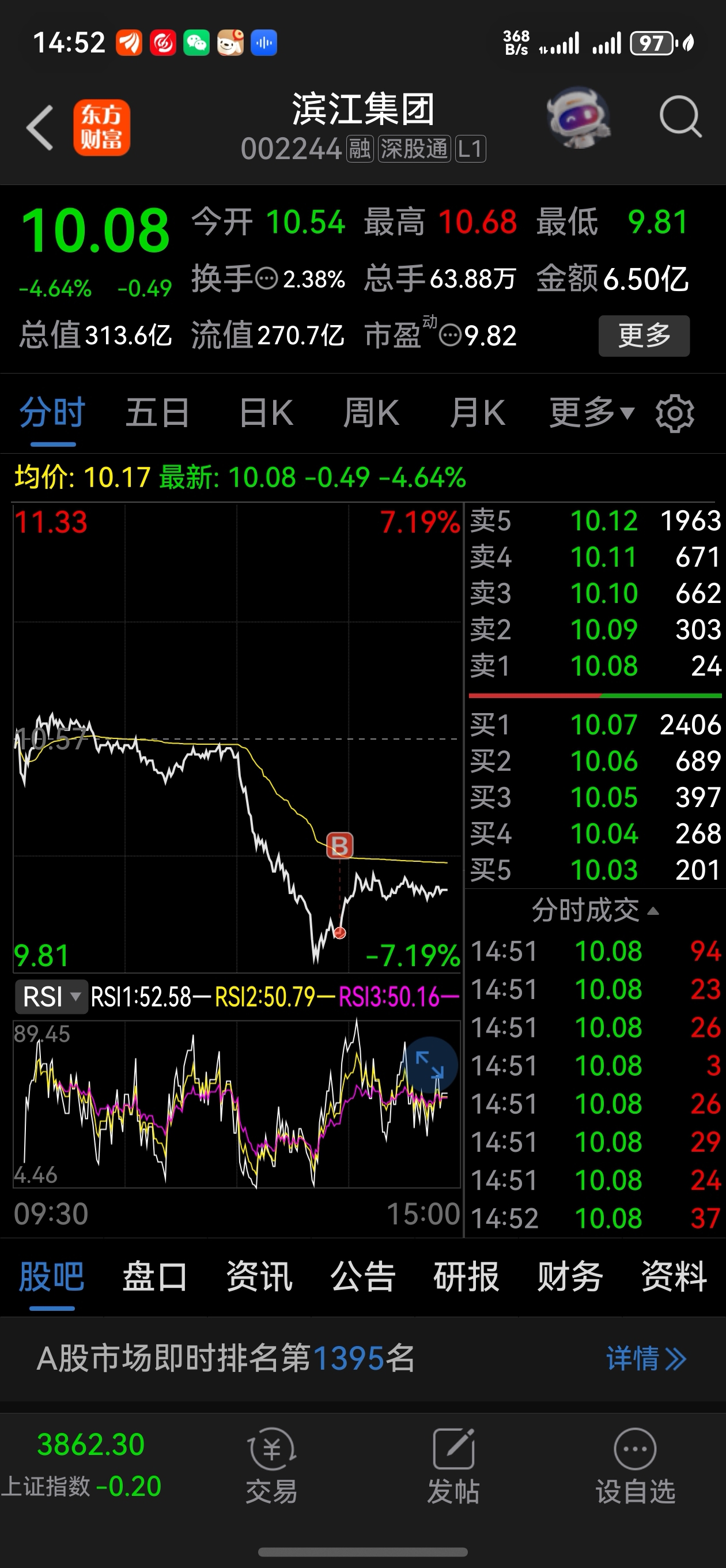 $滨江集团(SZ002244)$ 执行破10加仓,今日9.94加仓了。