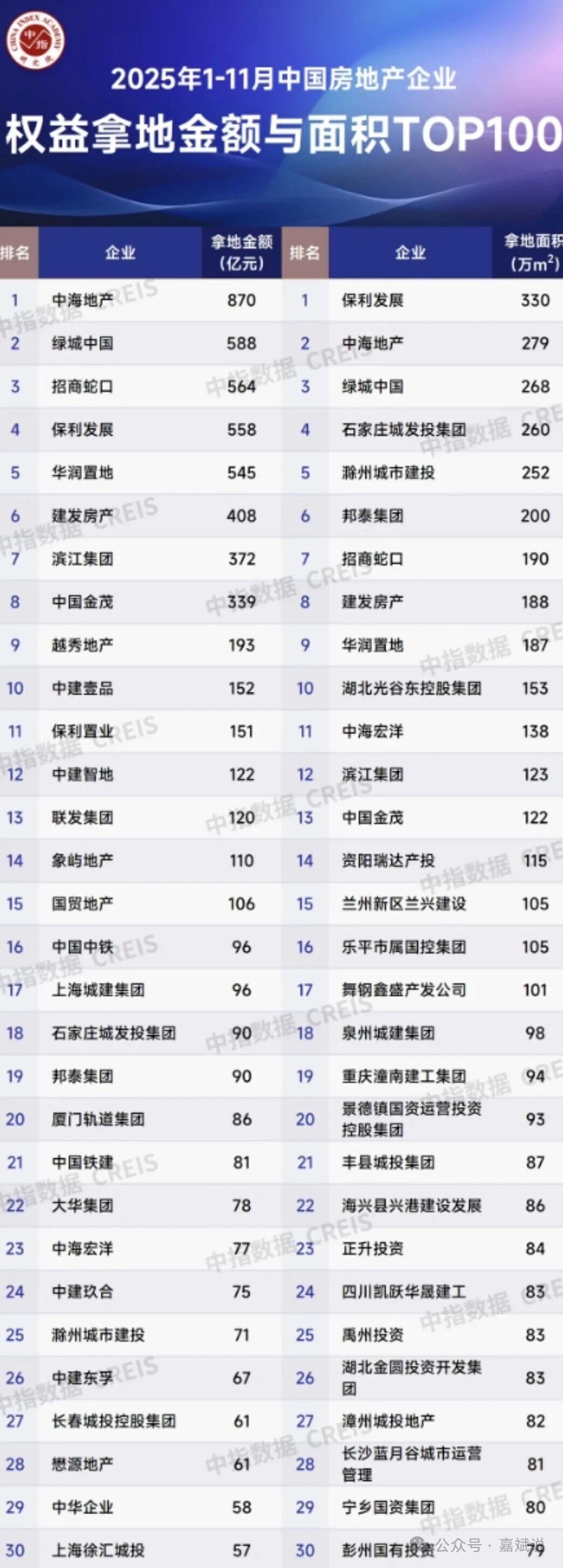 $滨江集团(SZ002244)$ 1-11月房地拿地排行榜