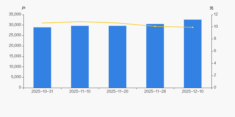 2025年10月31日至今,公司股东户数显著增长,区间涨幅为12.74%。2025年10月31日至2025年12月10日区间股价下降6.59%。