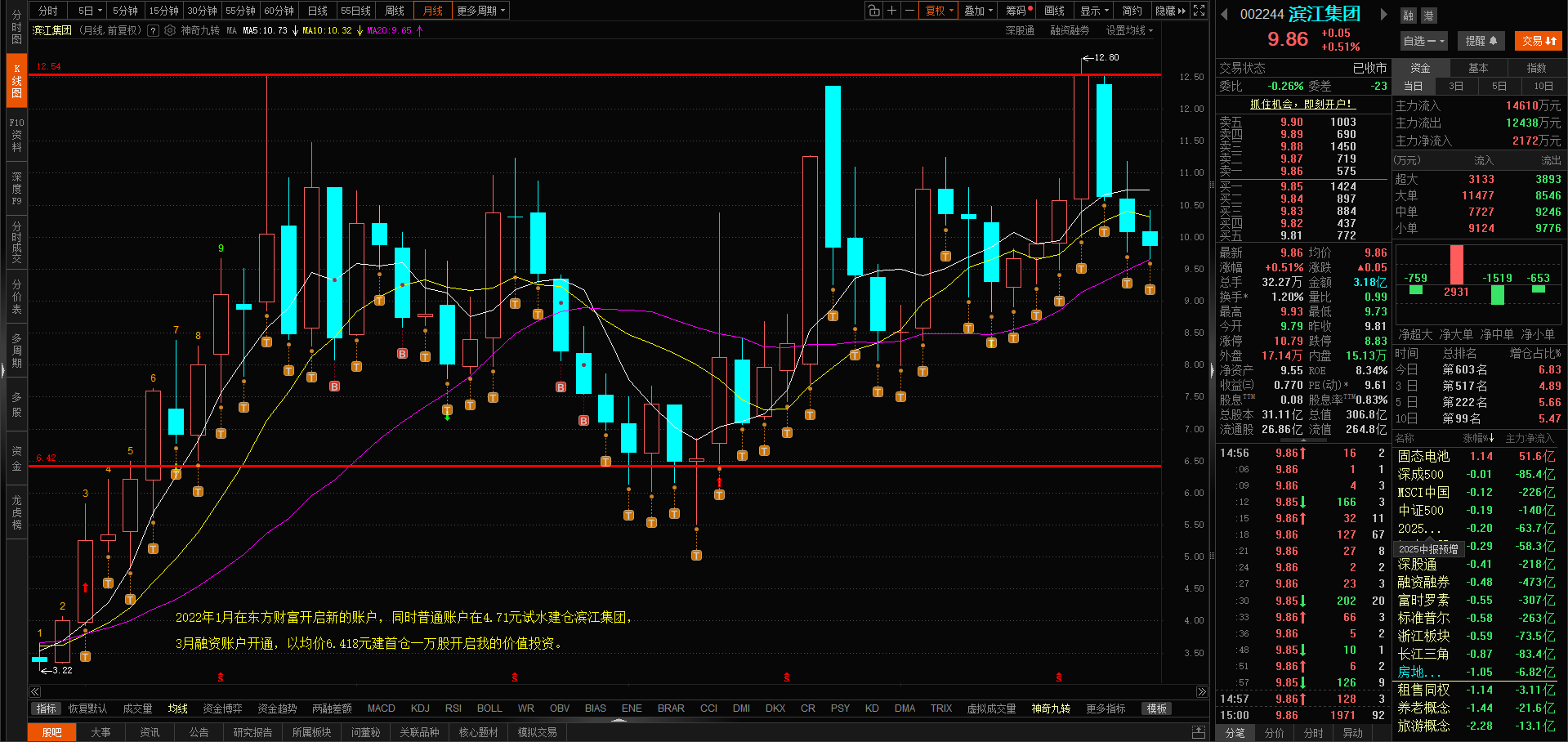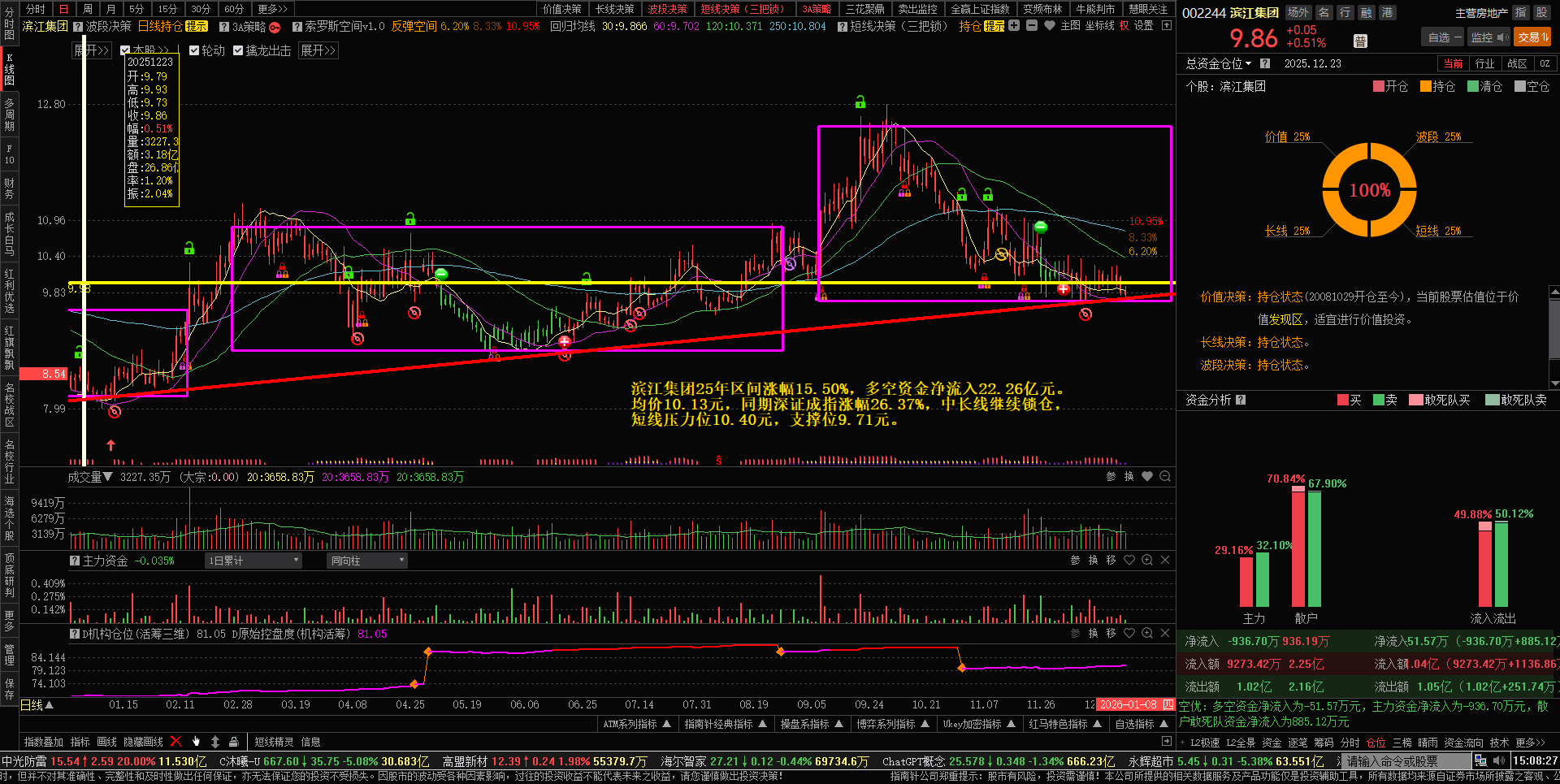 今日滨江缩量整理,换手率1.20%,涨幅0.51%,收盘价9.86元。今日多空资